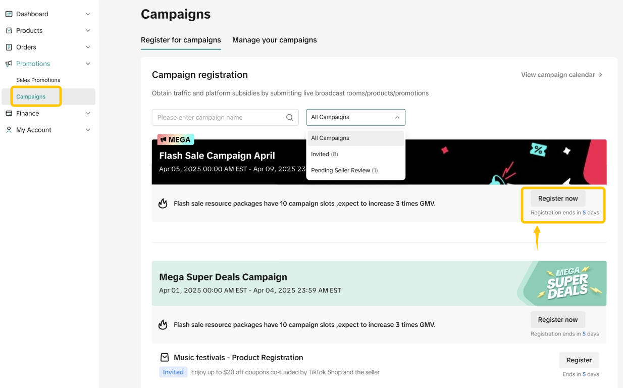 要在电脑端的卖家中心注册推广活动,请访问“推广活动”选项卡。点击“产品/店铺推广活动”。