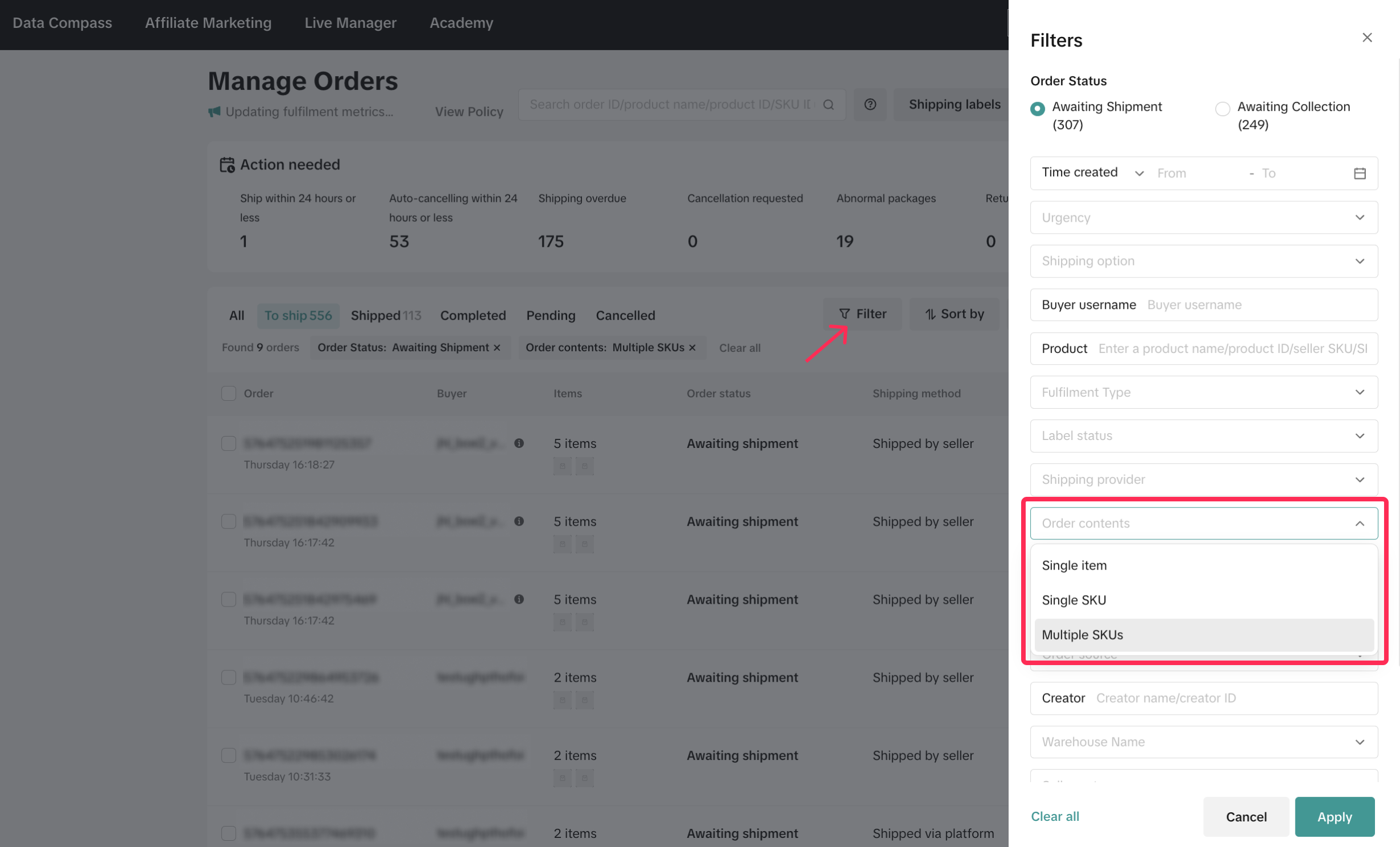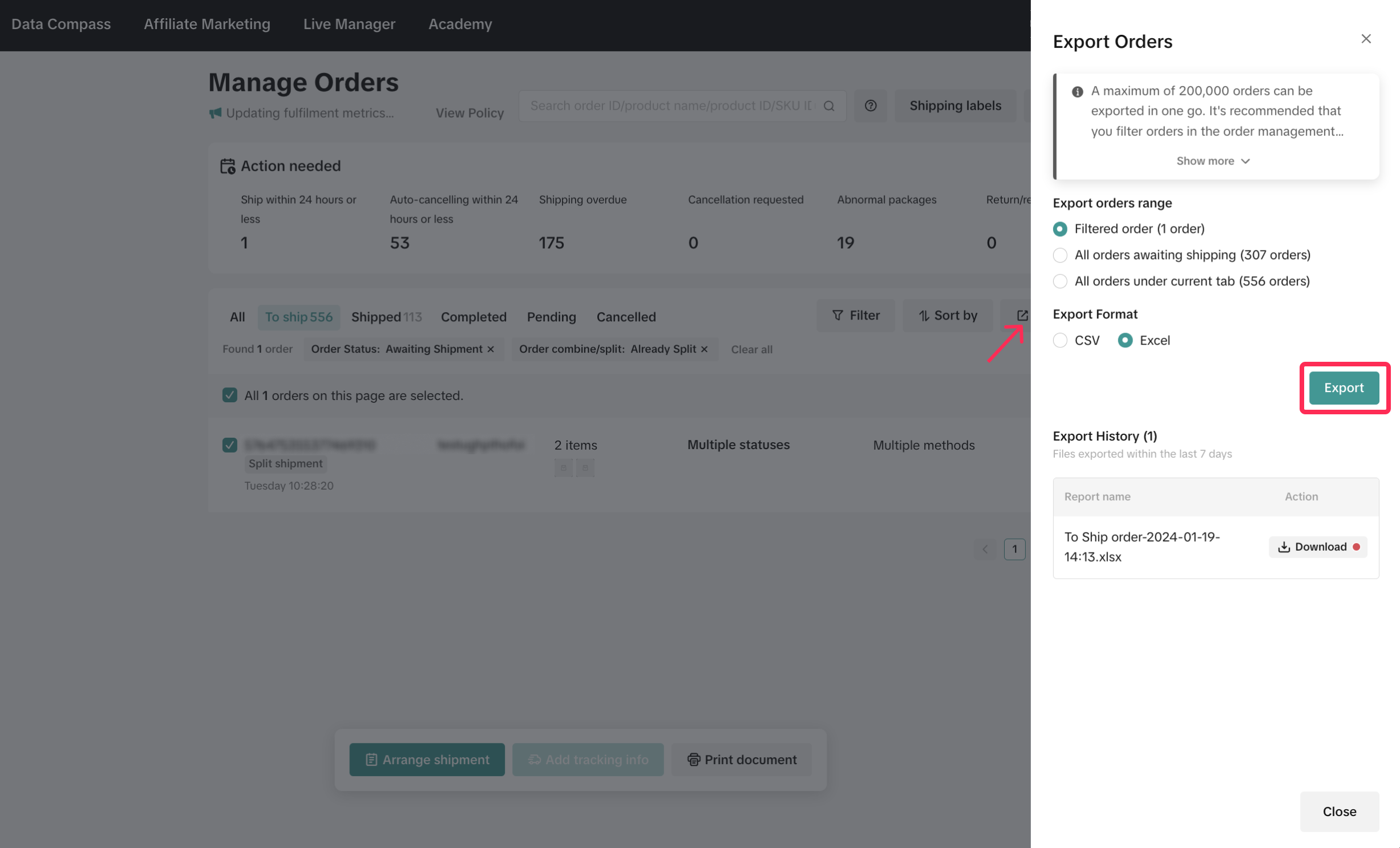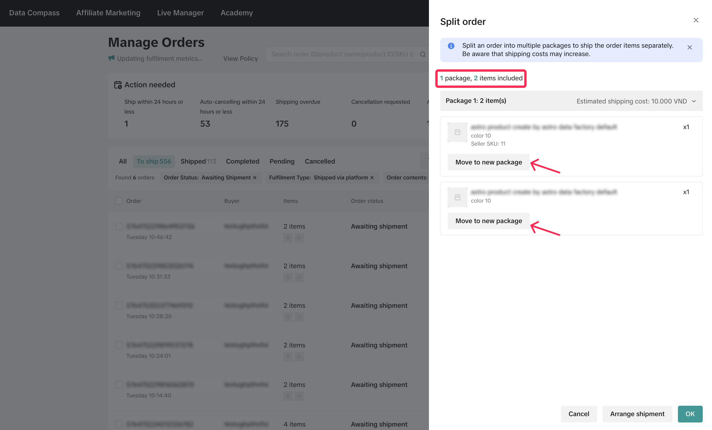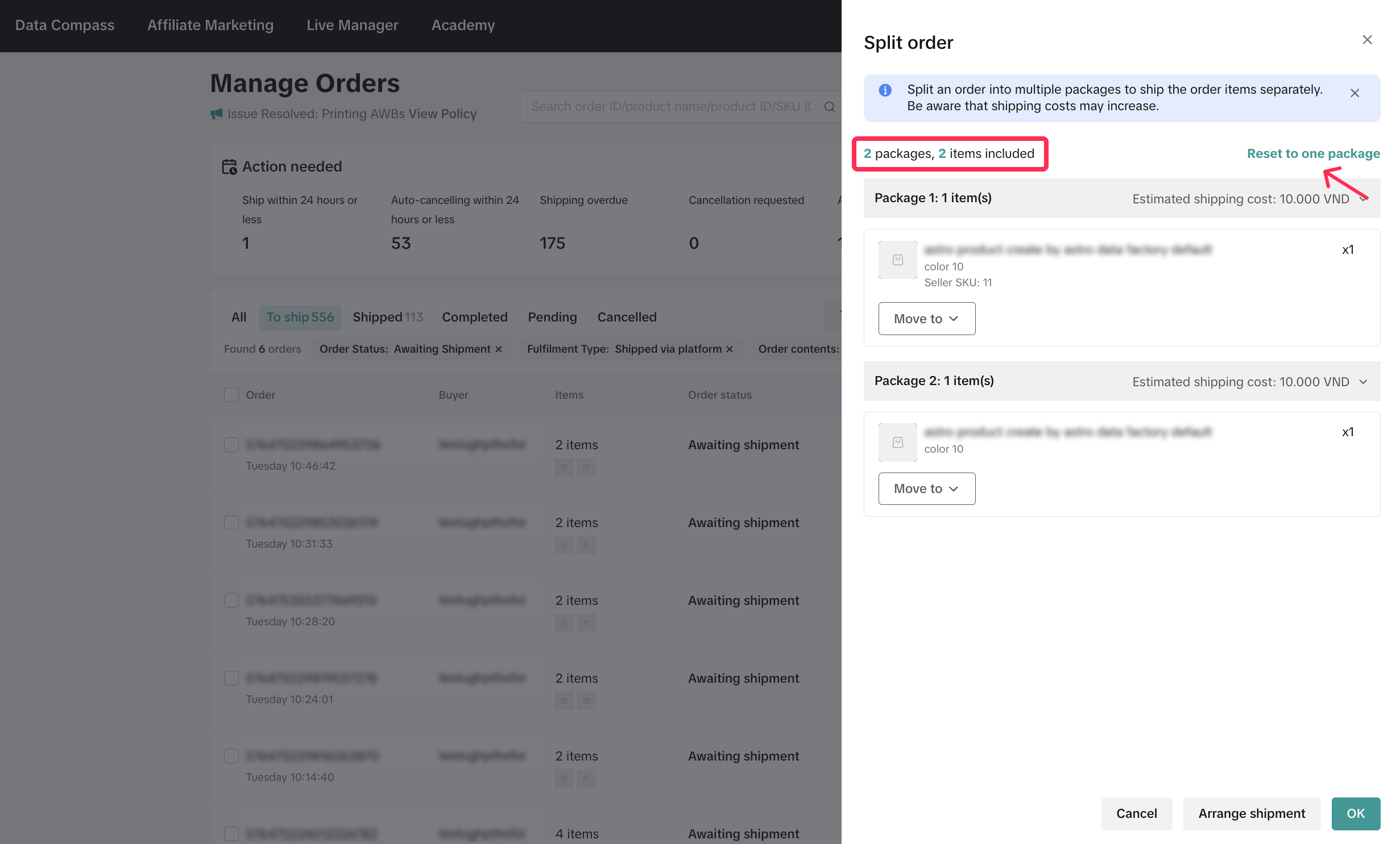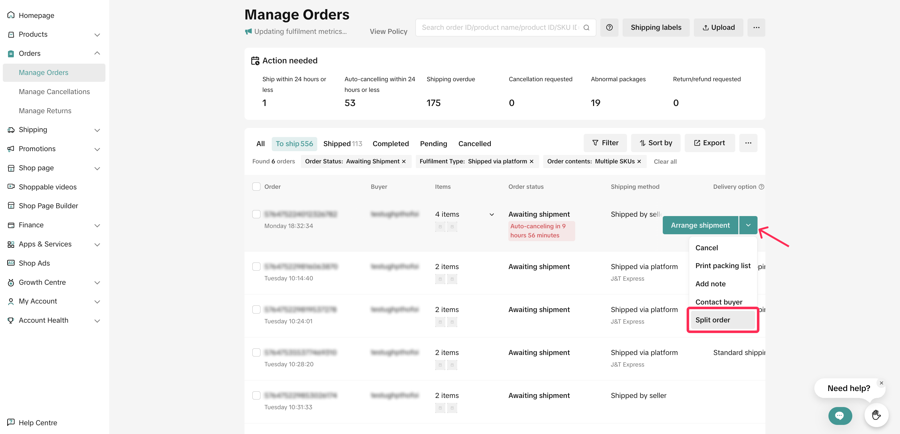 只有当订单包含多个 SKU 且状态为“待发货”时,才能拆分订单。请按照以下简单步骤拆分订单: