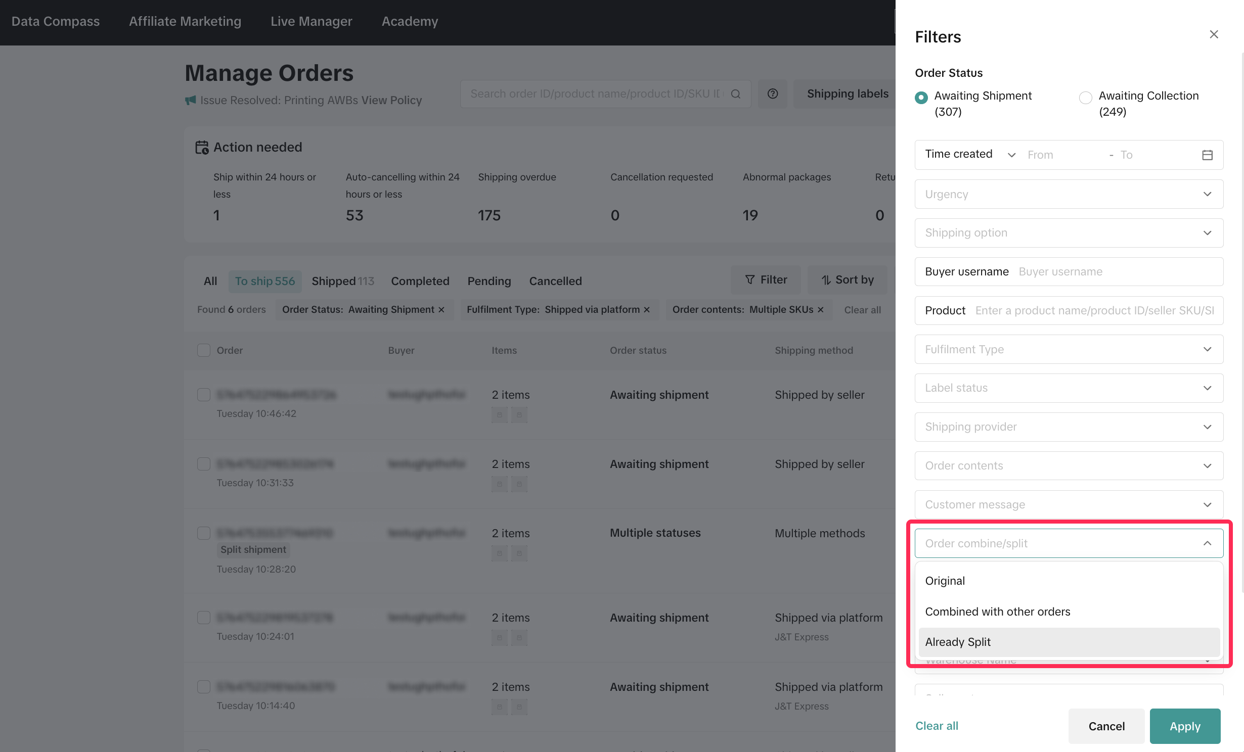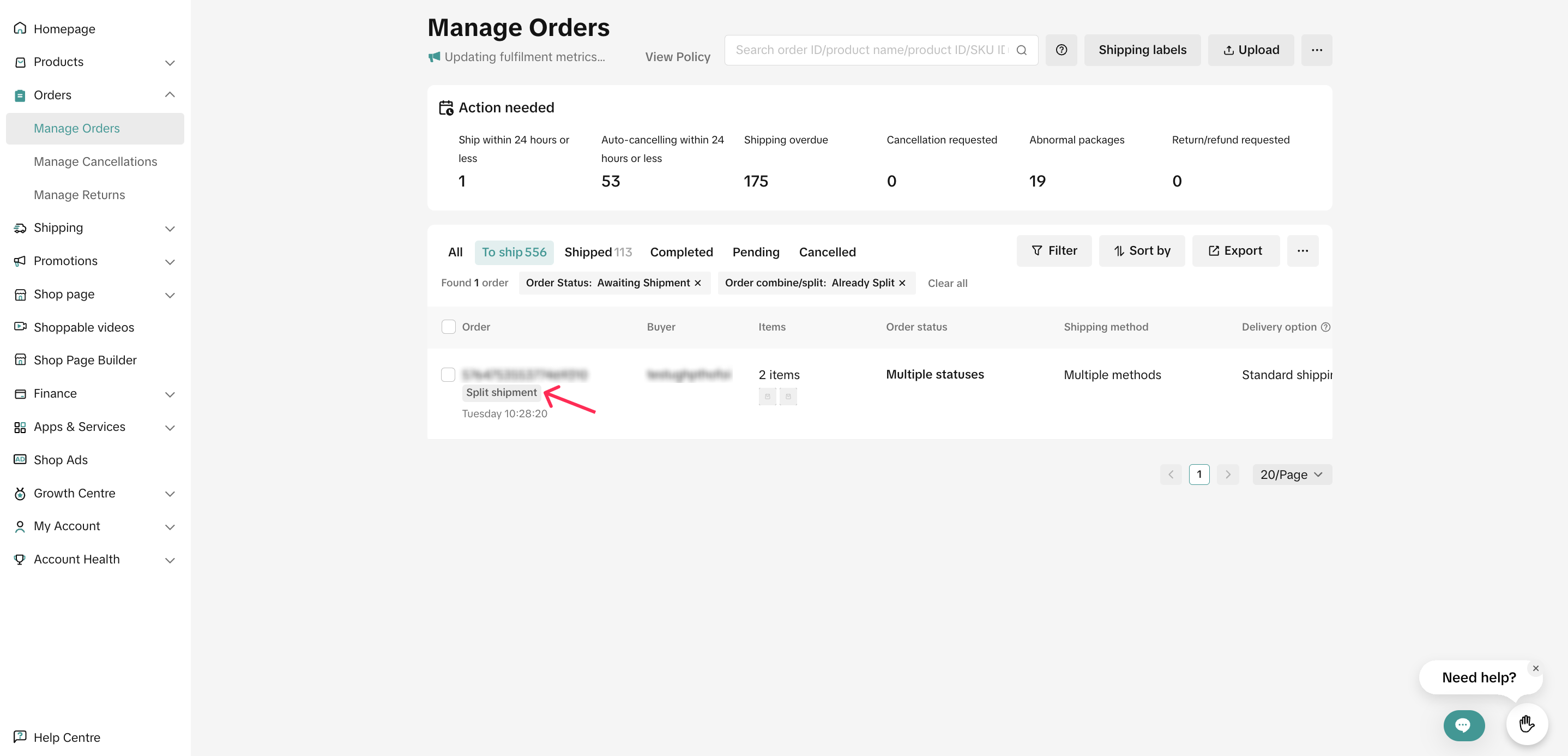 卖家可以在“管理订单”选项卡中查看拆分订单。