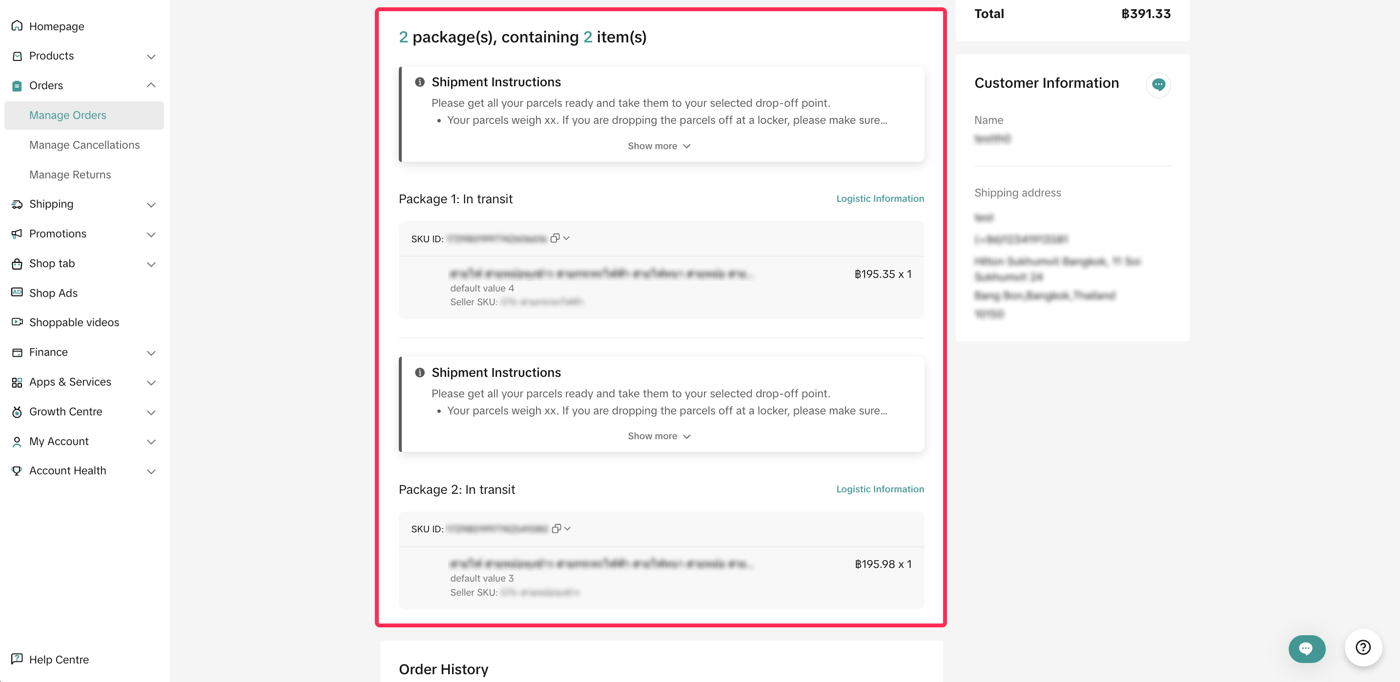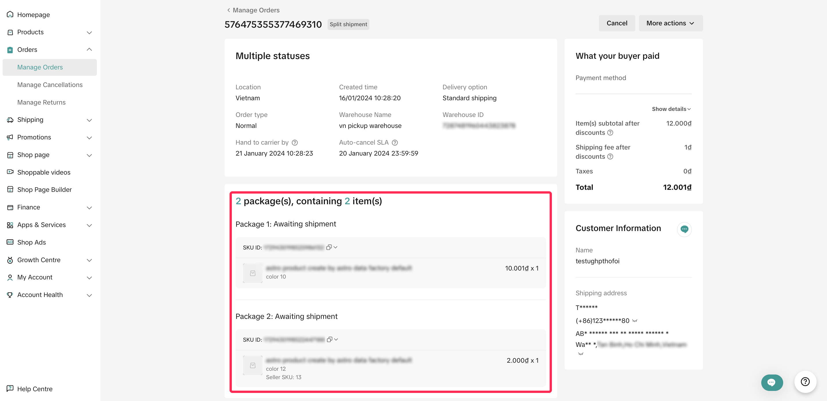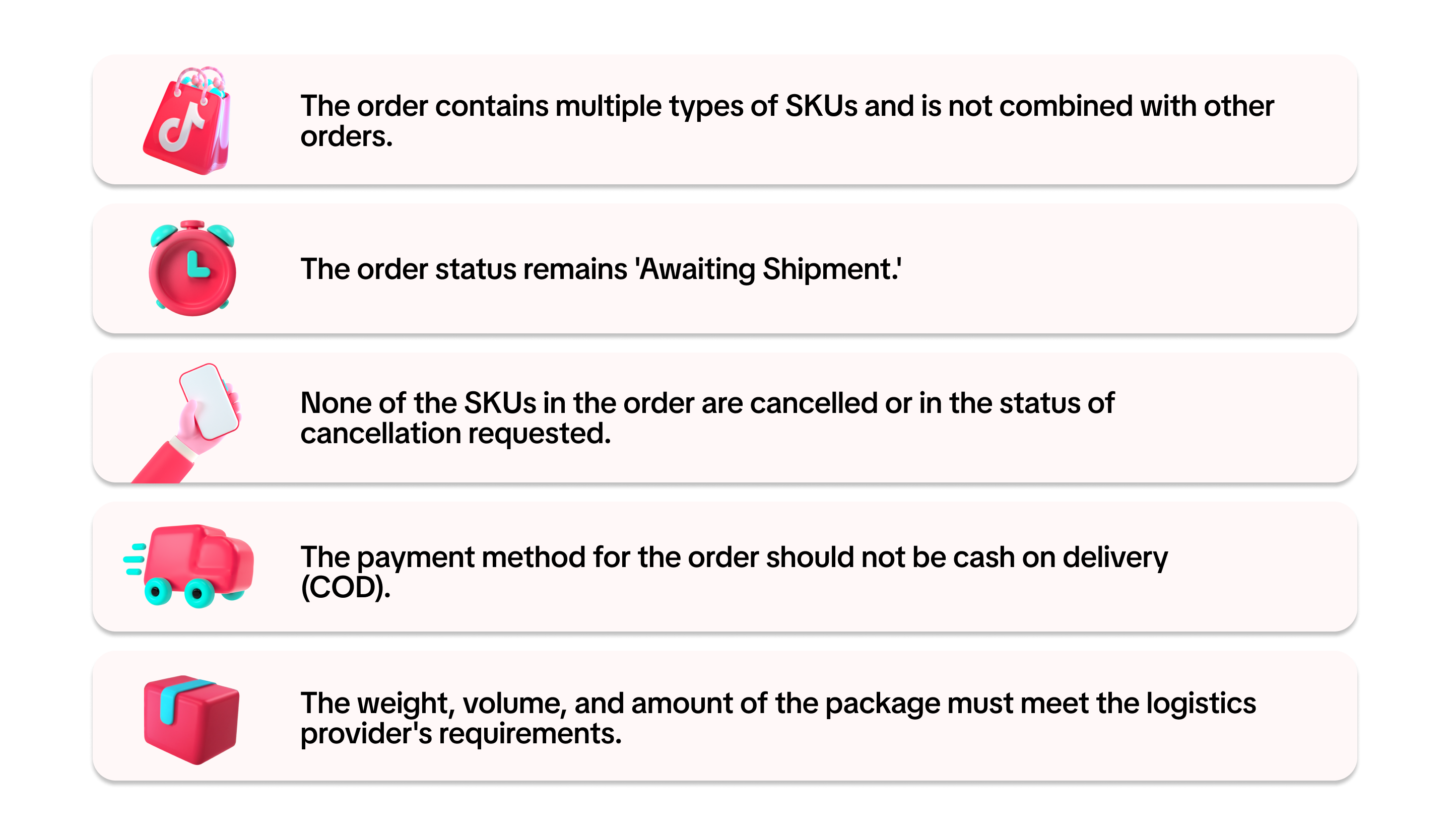 ❗️注意:即使 SKU 有多个数量,也不能将同一个 SKU 拆分成不同的订单。例如:对于包含 SKU A(数量:2)和 SKU B(数量:1)的订单