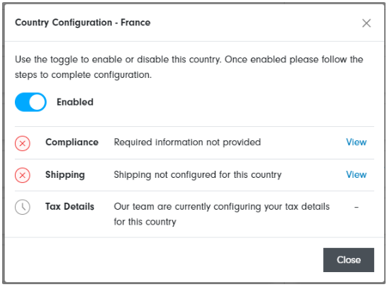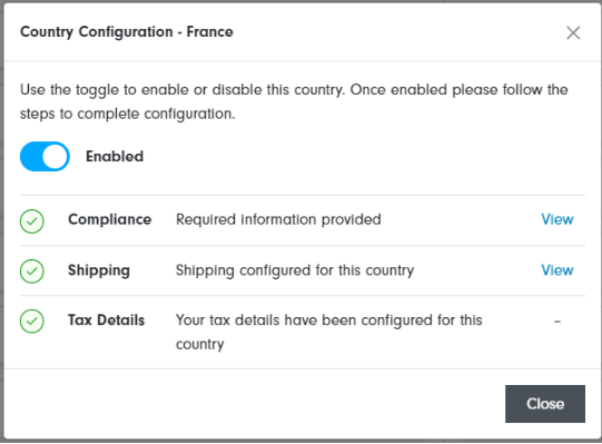 选择您想要配置的国家/地区,然后使用切换按钮启用该国家/地区。启用后,您将看到国家/地区设置的要求。您可以随时启用或禁用某个国家/地区。
