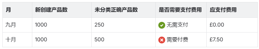 所有商家在收费前每月创建的产品的误差阈值为 25%。 如果超过此误差阈值,则对于其所有错误分类的产品收取 100% 的费用。