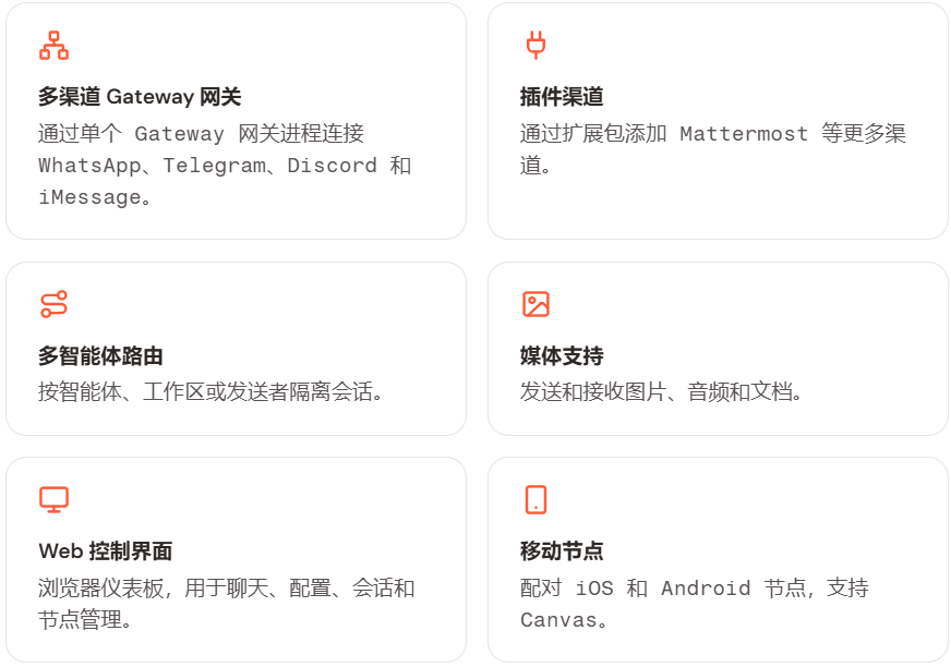 OpenClaw 通过单个 Gateway 网关进程将聊天应用连接到 Pi 等编程智能体。它为 OpenClaw 助手提供支持,并支持本地或远程部署。