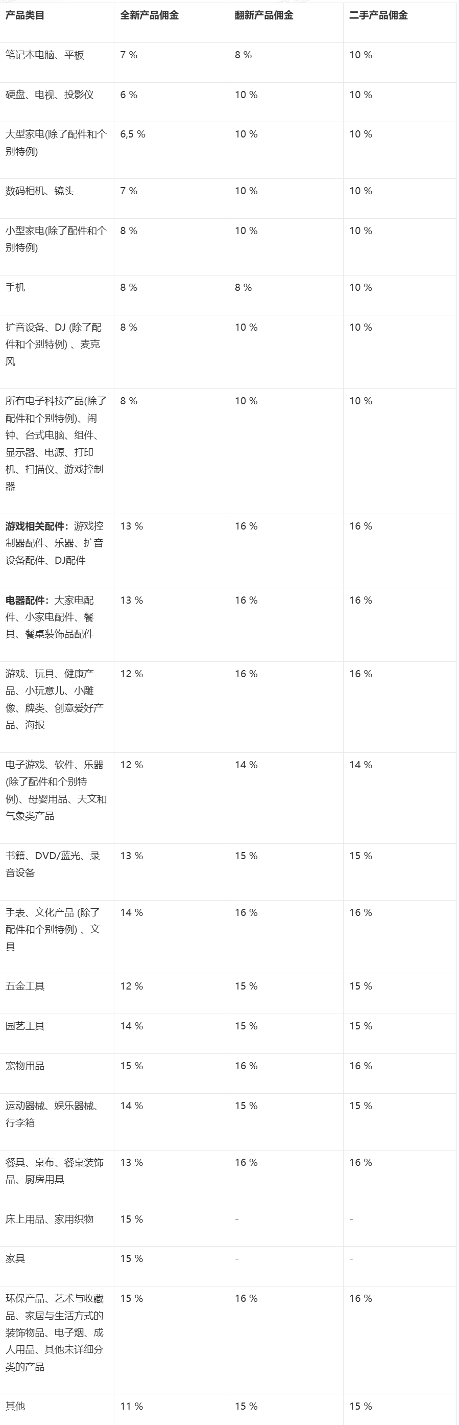 平台不同产品类目佣金一览: