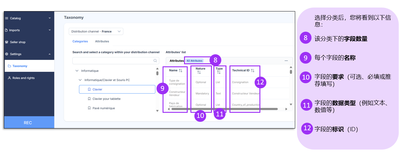 注意:第1行 表示字段的名称,第2行 表示每个字段对应的技术ID(ID technique),供系统识别使用。填写时请勿修改或删除这两行,否则可能会导致导入失败。