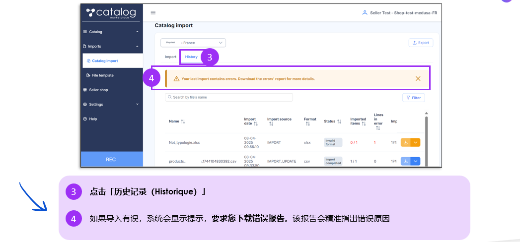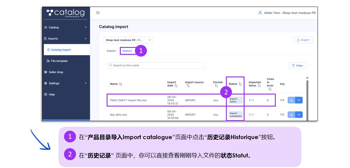 在“状态Statut”列中,你将看到文件的导入状态,可能为以下四种之一: