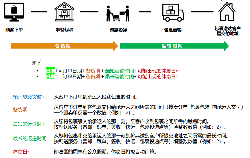 在Fnac网上商城,对于每一个offer,卖家都需要向客户提供预计到货时间: 如:在1月1日到1月4日期间到货。此预估时间是从客户下单,至订单到货所需的时间。 这些数据对客户来说非常重要。 因此,卖家应如实填写情况,遵守期限,以保证客户满意度和店铺KPI。