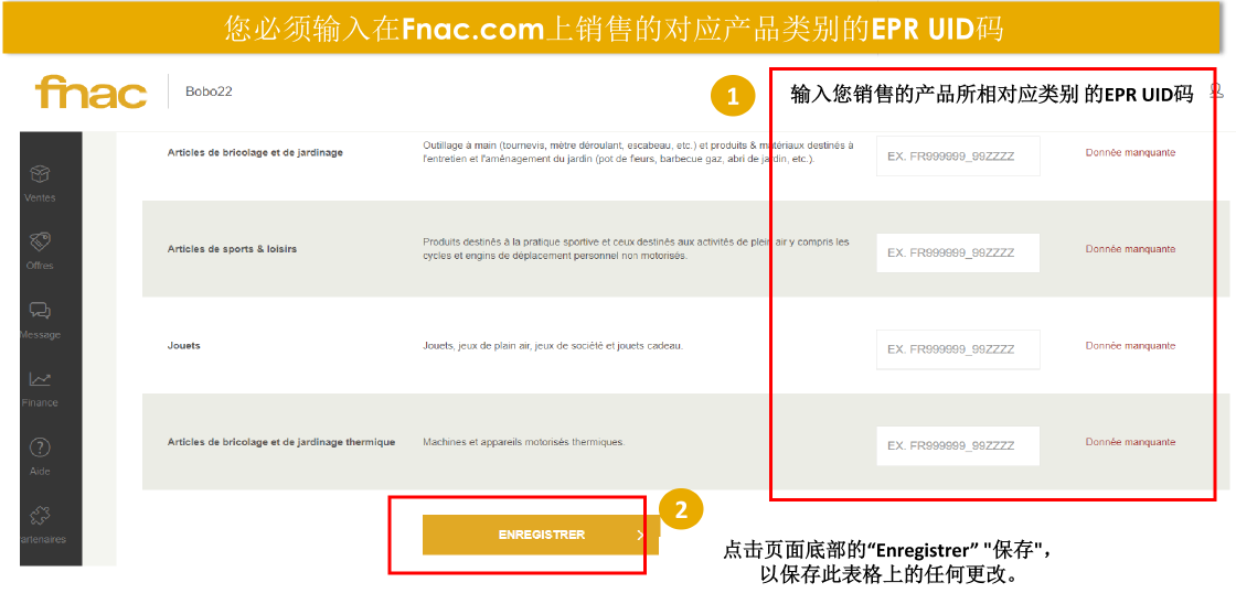 如果您没有提供您Fnac店铺的EPR码,我们将从您的余额中扣除Fnac需要申报并支付给环保组织的废旧物品处理费用。