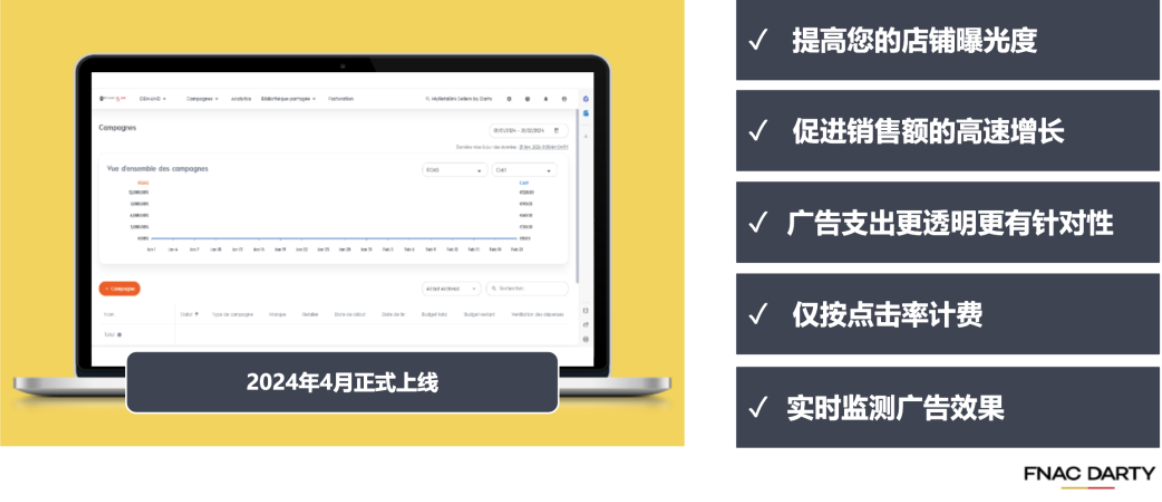 为了更好地助力品牌出海,FNAC DARTY 已于2024年4月正式上线 CPC 站内广告投放服务。通过这一新服务,卖家可以灵活设置广告预算和出价,实时监控广告表现并进行优化,更加精准地触达目标受众,有效提升广告投资回报率,实现业务的快速增长。