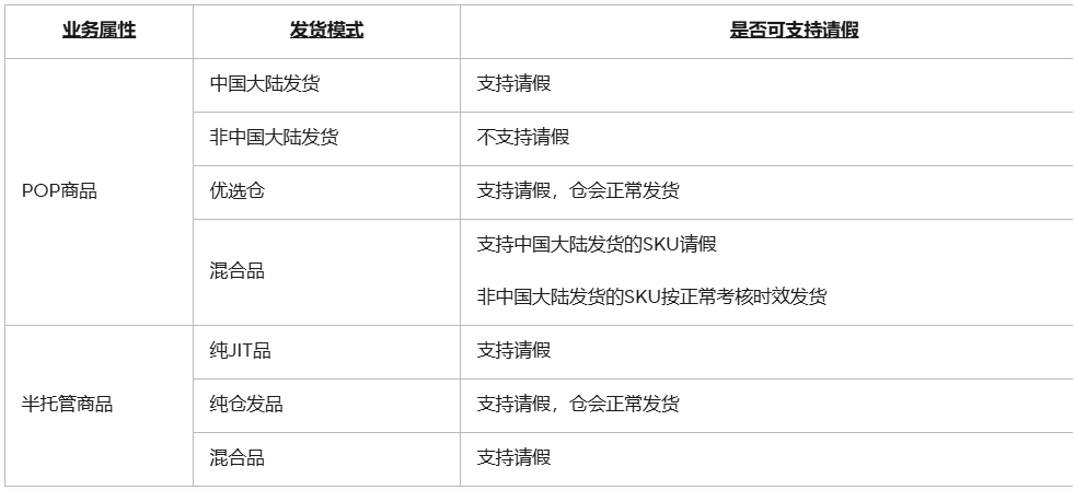 备货模式含JIT的半托管商品、自运营(POP)商品支持请假,具体根据不同的发货模式规则如下: