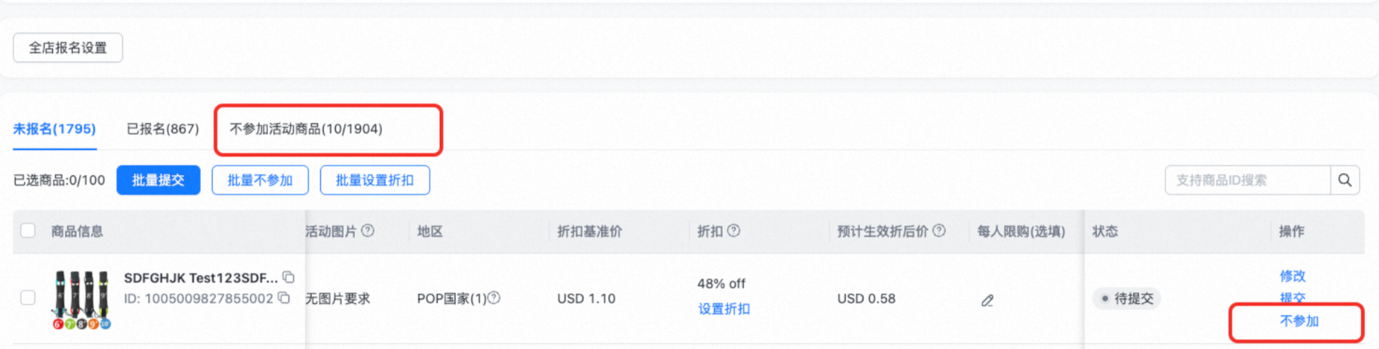 您可以在未报名页面,通过“不参加”的能力,选择商品不参加活动。