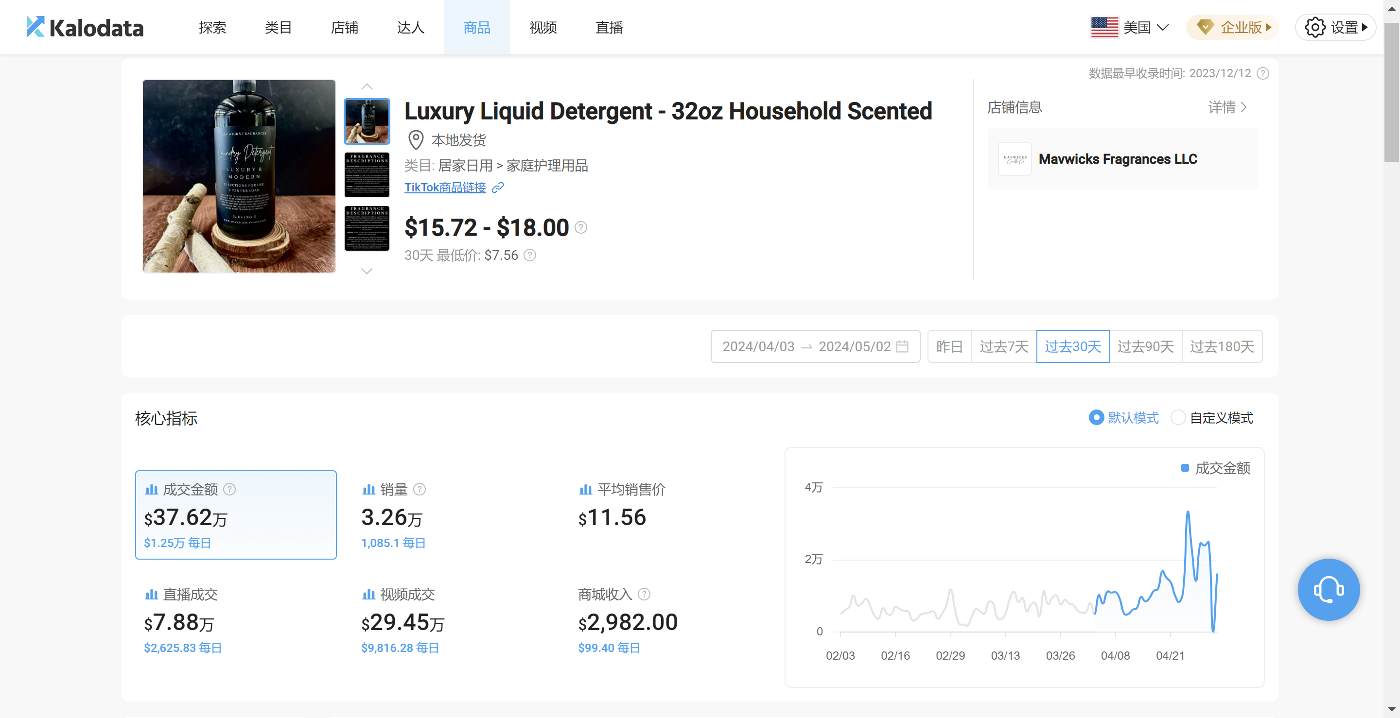 TikTok 这款洗涤剂具备强效清洁配方,仅需两汤匙即可清除顽固污渍和异味,同时保护衣物,不掉色、不褶皱,洗后衣物香气独特。@llllilymarie博主发布视频推荐,引发超25万播放和近1.5万点赞,持续上升。TikTok Shop过去30天平均售价11.56美金,每日平均出货1085单,销售额高达37.62美金;属主营居家用品的Mavwicks Fragrances LLC店畅销商品之一。