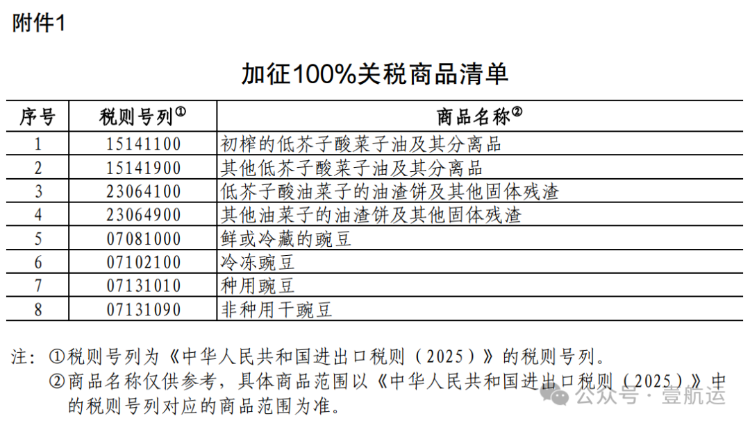 据国务院关税税则委员会公告,自2025年3月20日起,中国将对原产于加拿大的部分进口商品加征关税。此举是对加拿大自2024年10月起对中国电动汽车、钢铁和铝产品加征关税的回应。加拿大措施被视为保护主义,严重违反世贸组织规则并损害中方权益。中国加征关税的具体措施包括:对菜子油、油渣饼、豌豆加征100%关税;对水产品、猪肉加征25%关税;对附件所列商品在现行税率基础上加征相应关税,现行保税、减免税政策不变。加征关税税额按关税计税价格×加征关税税率计算,进口环节增值税、消费税按规定计征。