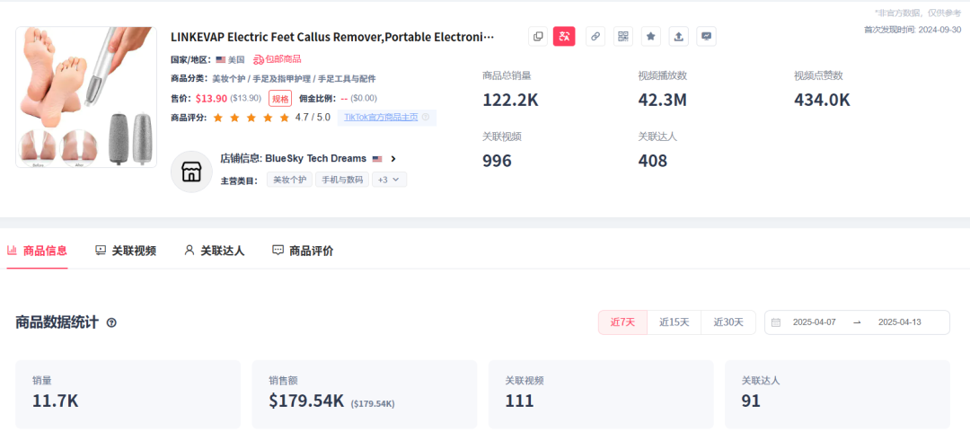 据Shoplus超店有数数据显示,电动足部护理神器"LINKEVAP Electric Feet Callus Remover"近期强势冲上TikTok美区商品销量榜第19位。这款产品凭借360°旋转磨头设计,既能高效去除脚部老茧又保护健康皮肤,简单安全的操作体验赢得消费者青睐。数据显示,4月7日至13日短短一周内销量突破1.1万件,累计销售额达11.7万美元,成为近期足部护理赛道的现象级爆品。