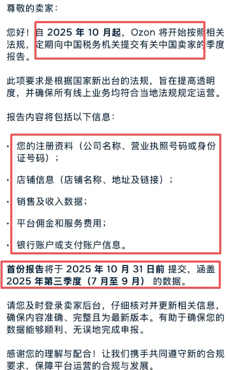 2025年10月起,Ozon 平台将依据国家新规,定期向中国税务机关提交中国卖家的季度报告,首份报告需在 10 月 31 日前提交,涵盖 2025 年第三季度(7 月至 9 月)数据,报告内容包括卖家注册资料、店铺信息、销售及收入数据、平台佣金和服务费用、银行或支付账户信息,卖家需及时登录后台核对更新信息确保准确。