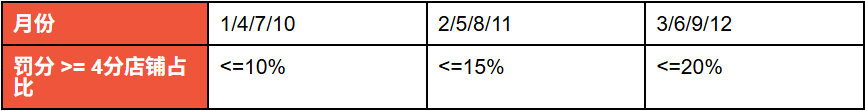 卖家上月罚分>=4分的店铺/卖家总店铺数的比例 (PP%) 需达到以下标准: