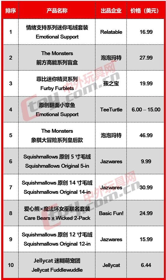 出海网11月19日消息,美国亚马逊10月潮玩毛绒热卖榜TOP10显示,原创类产品表现突出,Relatable的"情绪支持系列迷你毛绒套装"以16.99美元价格超越泡泡玛特登顶榜首。该系列以万圣节主题和萌类治愈为特色,设计灵动且价格亲民,一套5件总价低于20美元,契合美国市场性价比消费心理。泡泡玛特两款产品位列第二和第五,价格分别为27.99美元和46.99美元。榜单原创类与IP类产品比例为7:3,孩之宝、Squishmallows、Jellycat等知名品牌上榜,IP类产品排名环比下降。上榜产品均价为23.94美元,较9月39.49美元大幅下降,原创类均价19.92美元卡在20美元"高价分水岭"之下,显示市场整体趋向性价比,但高端产品仍凭各自亮点占据半壁江山。
