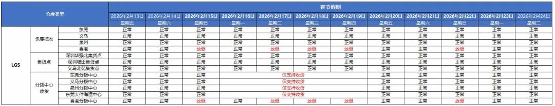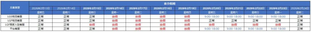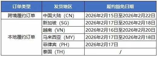 春节假期期间,平台在综合考虑发货地公共假期和保障商家发货优势后,将在下表中特定日期,豁免商家发货履约时效。并将2月23日(周一)、2月14日(周六)、2月28日(周六)纳入商家履约考核时间。