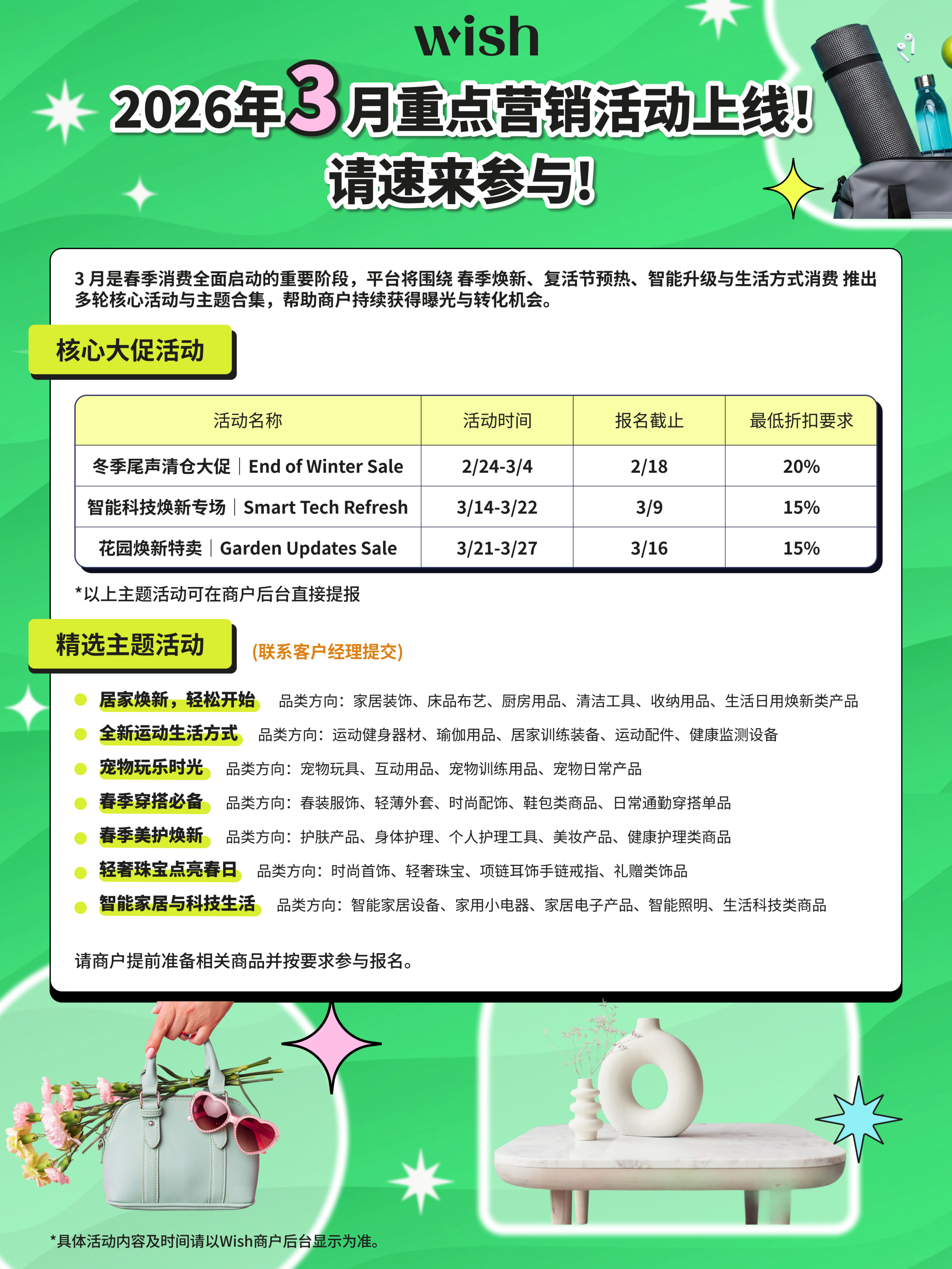 出海网2月15日消息,Wish平台正式推出2026年3月营销活动计划,聚焦“春季焕新”主题,围绕季节转换、复活节预热及智能生活方式推出多轮促销。核心大促包括“冬季尾声清仓大促”(2月24日-3月4日)、“智能科技焕新专场”(3月14日-22日,需15%最低折扣)及“花园焕新特卖”(3月21日-27日,需15%最低折扣),商户可直接通过后台报名。同时,平台设立七类精选主题会场,涵盖居家焕新、运动生活、宠物用品、春装穿搭、美护产品、轻奢珠宝及智能家居,相关商家需联系客户经理提交商品参与。本次活动旨在帮助商户高效曝光与转化,请及时准备货品并关注后台具体安排。
