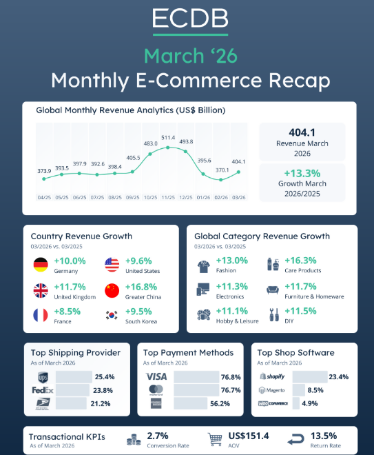 出海网4月3日消息,2026年3月全球电子商务营收达4041亿美元,较2月环比增长,并实现13.3%的同比增长。地区表现方面,中国市场增速领先,大中华区同比增长16.8%;英国和德国分别以11.7%和10.0%的增长率紧随其后。从品类来看,个人护理(Care Products)同比增长16.3%,增幅最大,时尚和家具家居类别分别增长13.0%和11.7%。在物流服务方面,UPS、FedEx和USPS是当前全球电商采用最多的配送商。