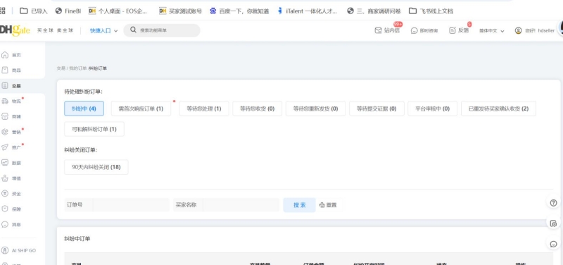 1、纠纷中:发货后产生纠纷且尚未关闭的所有纠纷订单。