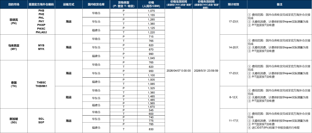 2026年五月(2026年5月1日-2026年5月31日)Shopee官方海外仓官方头程服务渠道费率将沿用2026年四月价卡,完整费率如表所示。