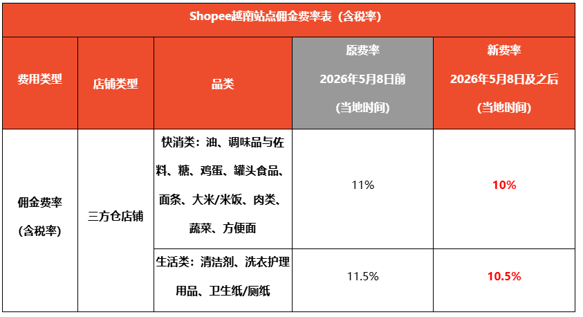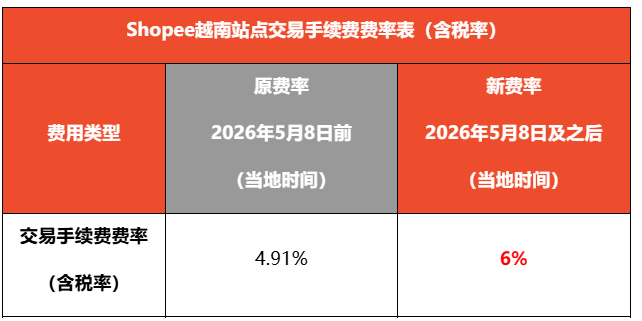 自2026年5月8日(当地时间)起,Shopee越南站点交易手续费率统一调整为6%(含税率)。