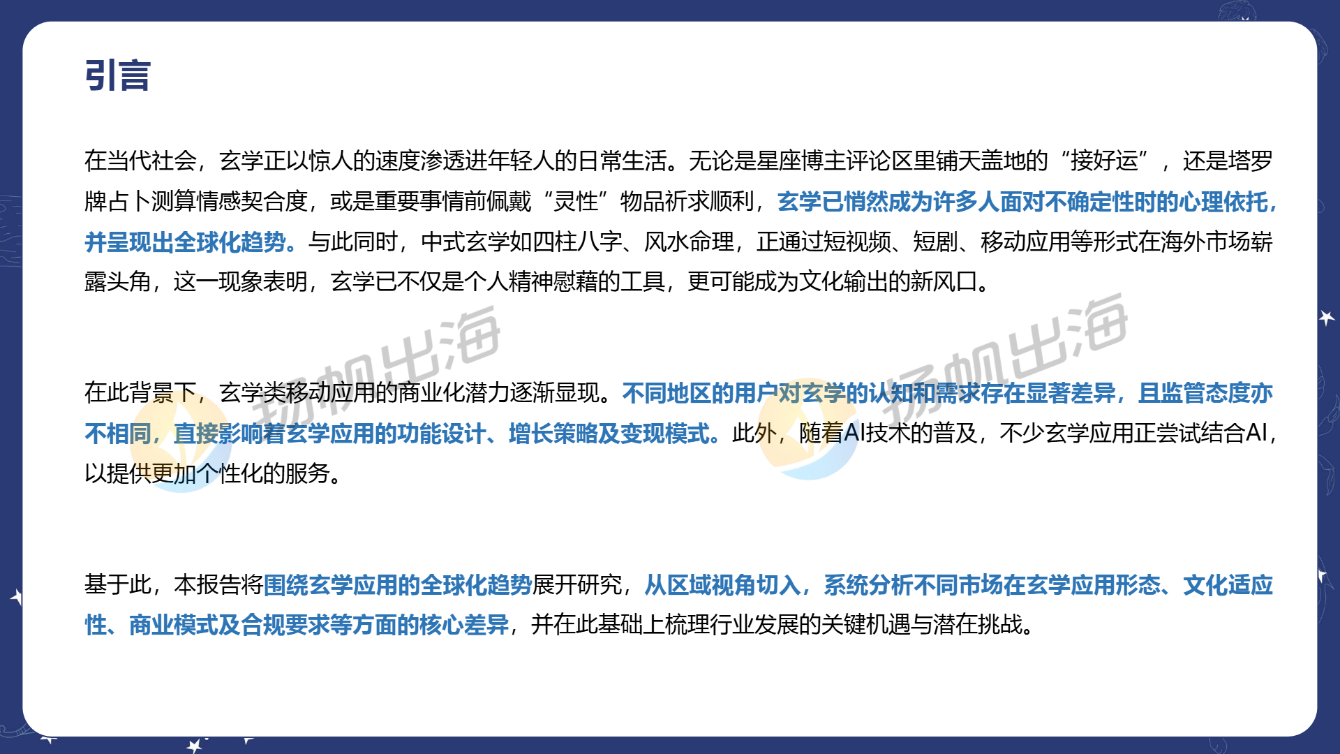 《2025 年玄学应用增长密码 Z 世代下的神秘学报告》系统剖析了全球玄学应用市场的发展态势,聚焦 Z 世代需求特征,从市场规模、区域差异、文化合规及未来机遇等维度,为行业参与者提供了全面参考。在当代社会,玄学已深度融入年轻人生活,从星座 “接好运” 到塔罗占卜情感,再到重要场合佩戴 “灵性” 物品,成为应对不确定性的心理依托,且呈现全球化趋势,中式玄学如四柱八字、风水命理也借短视频、移动应用等形式出海,兼具精神慰藉与文化输出价值。