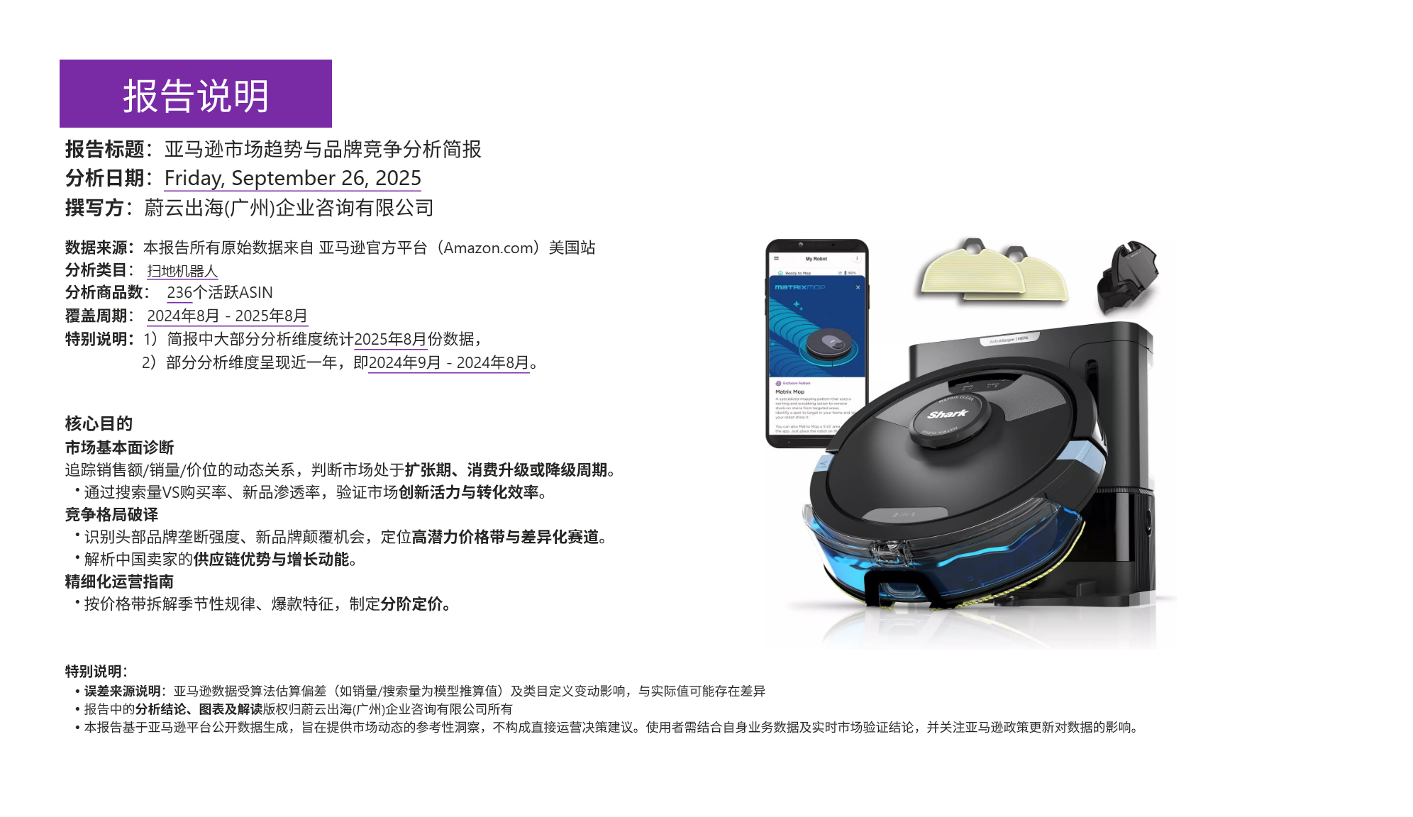蔚云出海 (广州) 企业咨询有限公司发布的《亚马逊市场趋势与品牌竞争分析简报》(分析日期为 2025 年 9 月 26 日,数据来源为亚马逊美国站,覆盖 2024 年 8 月 - 2025 年 8 月,聚焦扫地机器人品类 236 个活跃 ASIN),全面呈现了该市场的基本面、竞争格局、价位段特征及商品表现,为跨境电商品牌提供了关键决策参考。