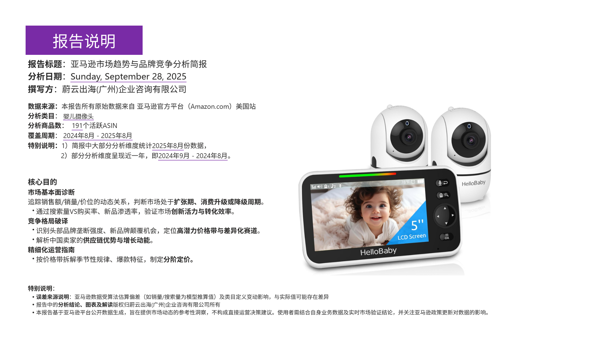 蔚云出海 (广州) 企业咨询有限公司发布的《亚马逊市场趋势与品牌竞争分析简报》,聚焦婴儿摄像头品类,基于亚马逊美国站 2024 年 8 月至 2025 年 8 月的 191 个活跃 ASIN 数据,从市场基本面、竞争格局、价位段特征及商品表现等维度展开分析,为跨境电商品牌布局该市场提供关键参考。