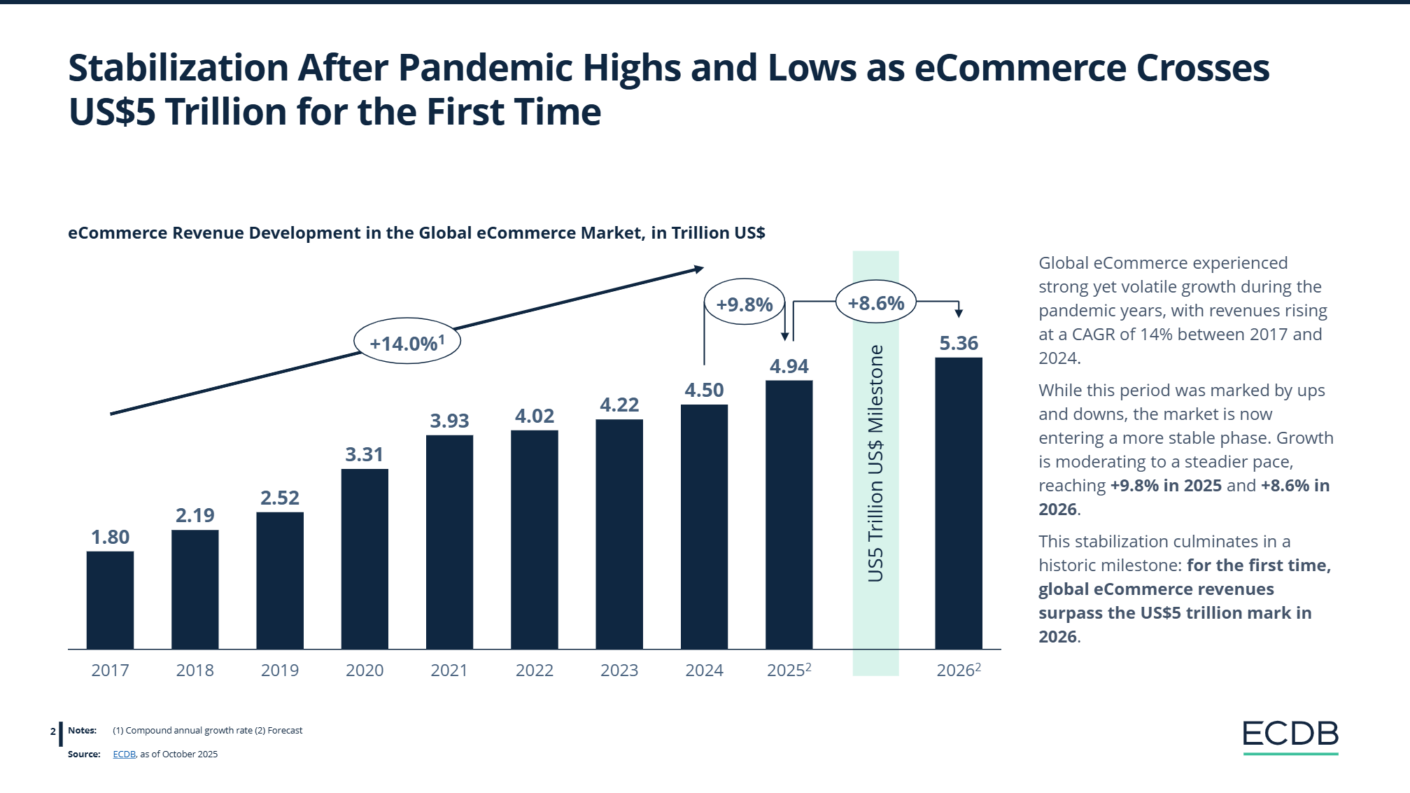 2026 年全球电商市场正式迈入全新发展阶段,在经历疫情期间的剧烈波动后,逐步实现稳定增长,这一趋势在 ECDB《全球电商展望 2026》报告中得到全面呈现。从整体规模来看,2026 年全球电商收入首次突破 5 万亿美元大关,达成历史性里程碑,这一成果标志着电商行业从高速扩张向高质量稳定发展的转型。回顾发展历程,2017 至 2024 年间全球电商收入以 14% 的复合年增长率实现强劲增长,虽期间伴随起伏,但市场韧性显著,到 2025 年增速放缓至 9.8%,2026 年进一步调整为 8.6%,这种温和的增速变化恰恰体现了市场的成熟与稳定,为行业长期健康发展奠定基础。