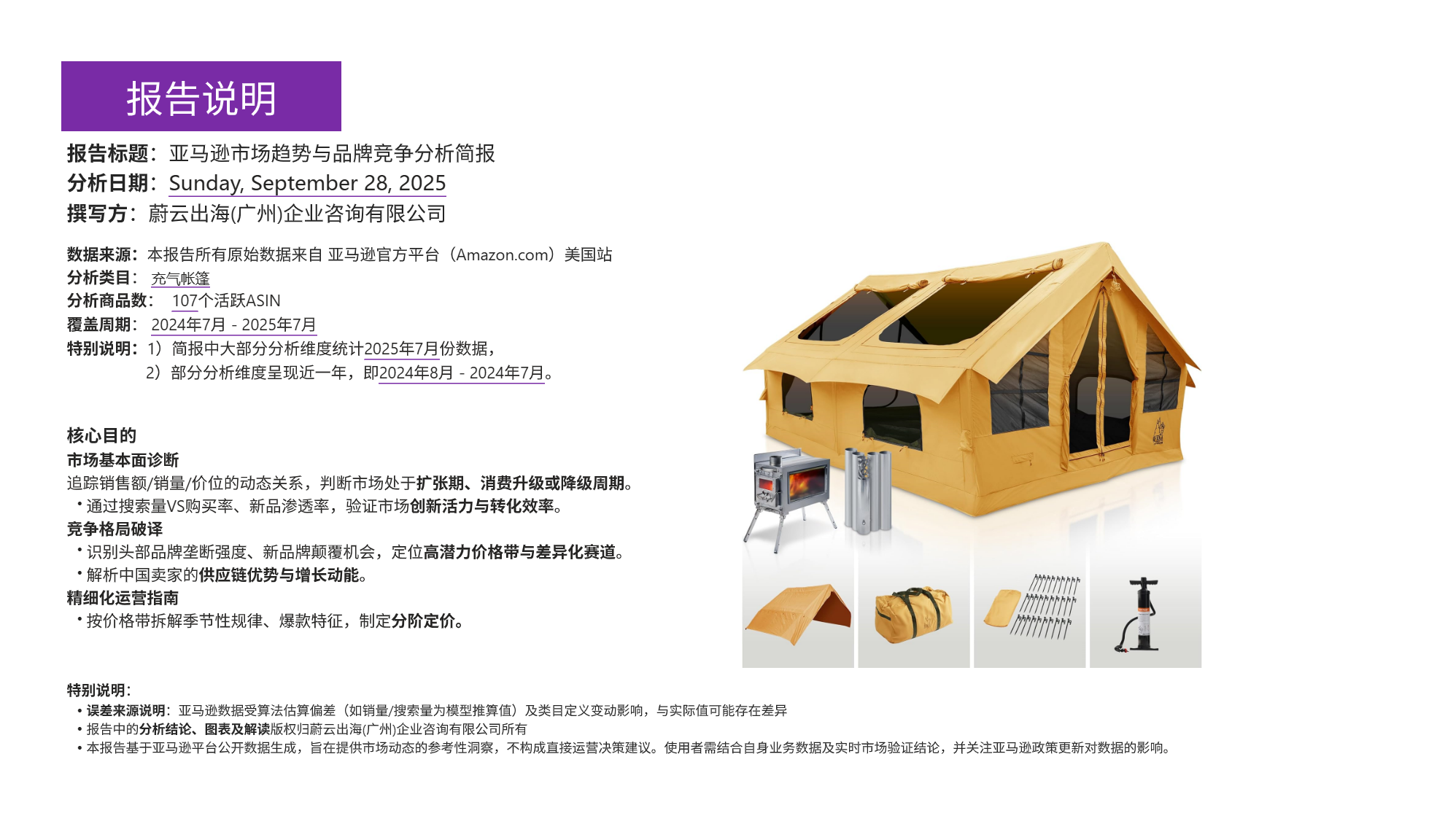 本报告由蔚云出海 (广州) 企业咨询有限公司撰写,分析周期覆盖 2024 年 7 月至 2025 年 7 月,聚焦美国亚马逊平台充气帐篷类目 107 个活跃 ASIN 数据,核心分析维度以 2025 年 7 月数据为主,部分维度呈现近一年动态,所有原始数据均来源于亚马逊官方平台美国站,旨在为跨境电商从业者提供市场动态参考性洞察,需注意的是,报告数据受算法估算偏差及类目定义变动影响,可能与实际值存在差异,且不构成直接运营决策建议,使用者需结合自身业务数据与实时市场验证结论,并关注亚马逊政策更新对数据的影响。