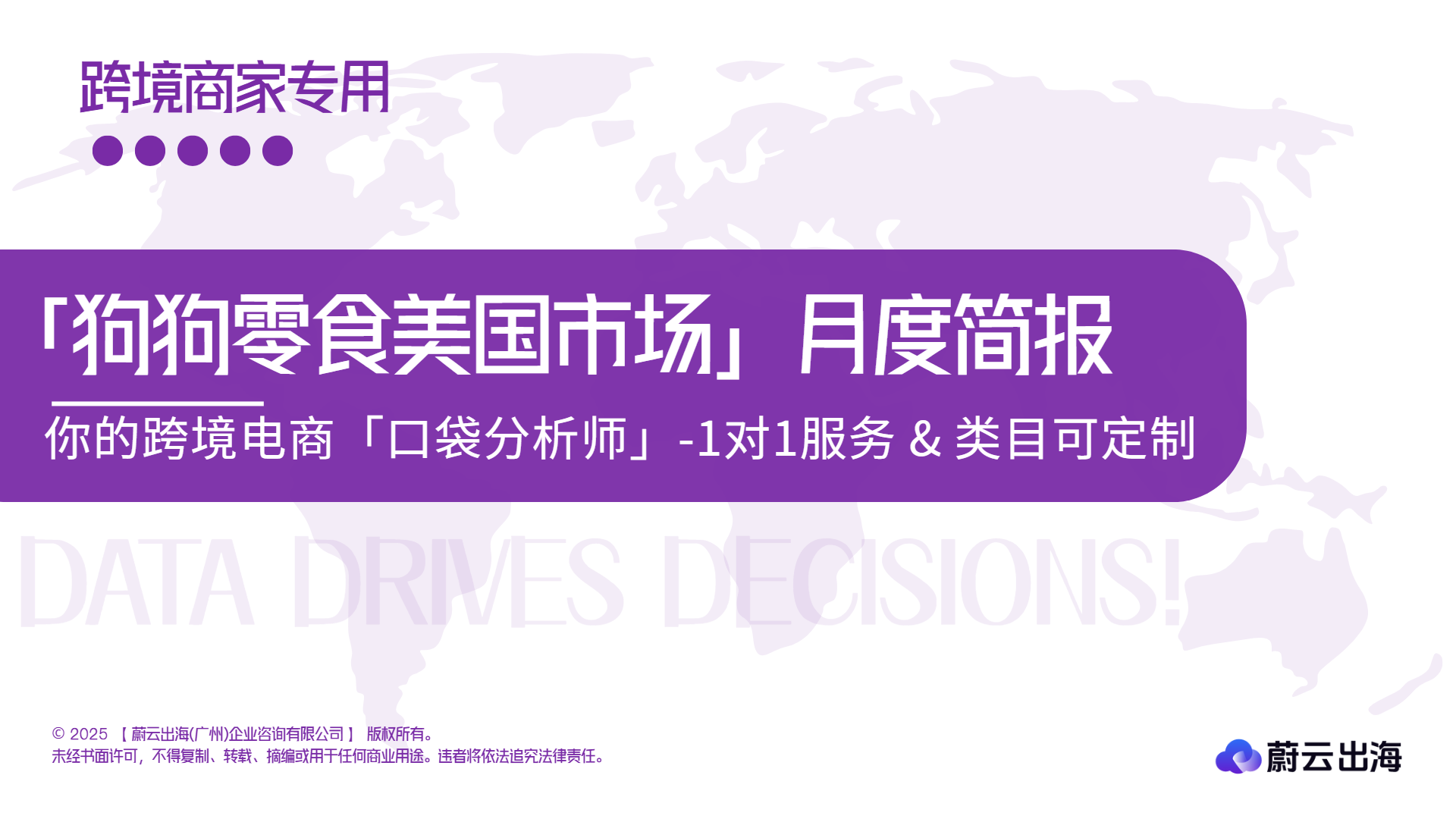 本报告由蔚云出海 (广州) 企业咨询有限公司于 2025 年 9 月 30 日撰写,数据来源于亚马逊官方平台美国站,聚焦狗狗零食类目 458 个活跃 ASIN,覆盖 2024 年 8 月至 2025 年 8 月周期,大部分分析维度统计 2025 年 8 月数据,部分呈现 2024 年 9 月至 2025 年 8 月数据,旨在为跨境电商从业者提供市场动态参考性洞察,不构成直接运营决策建议,使用者需结合自身业务数据及实时市场验证结论,同时需注意亚马逊数据受算法估算偏差及类目定义变动影响,与实际值可能存在差异。