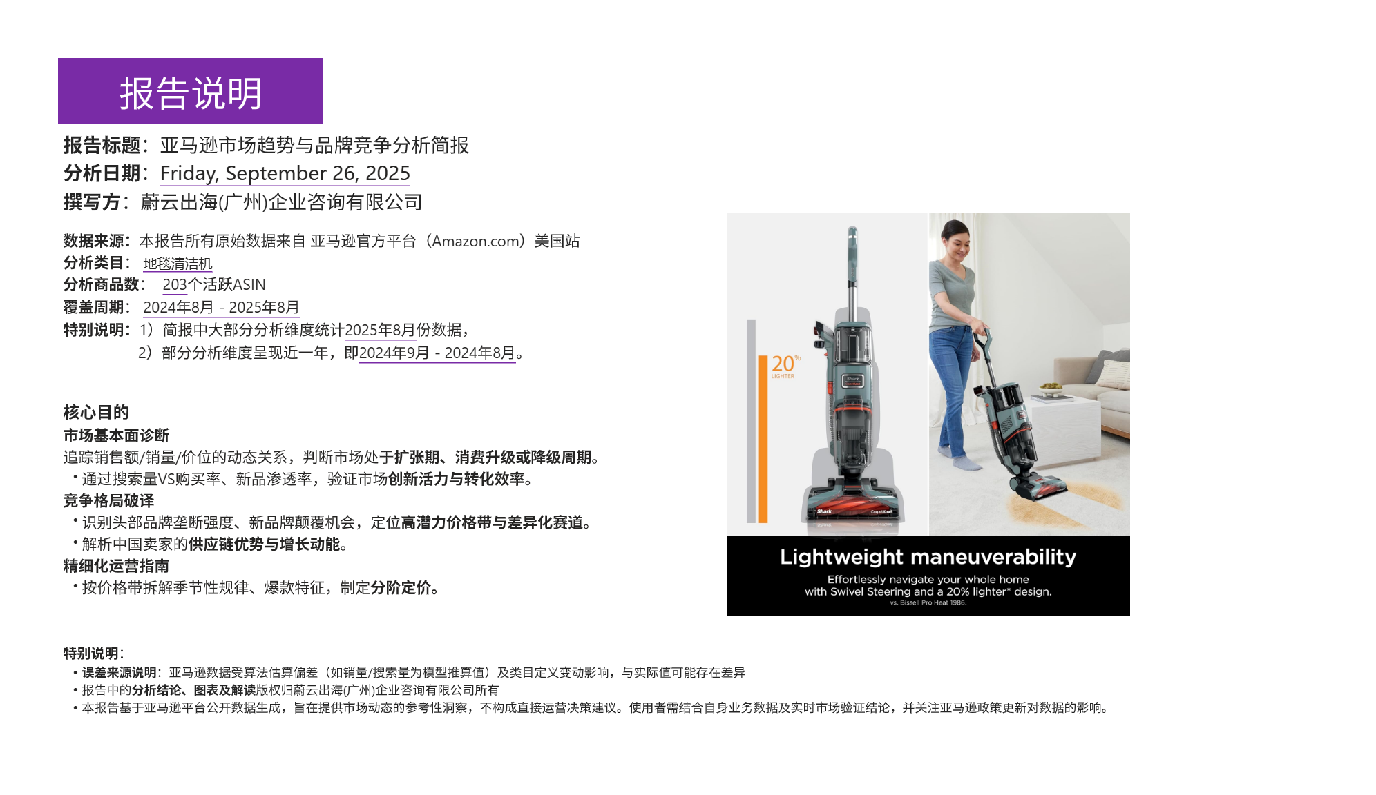 整体来看,美国亚马逊地毯清洁机市场正处于增长阶段,消费升级趋势显著,中国卖家凭借供应链优势在市场中快速崛起,中高端价位段及便携式、多功能产品成为竞争热点。不过需注意的是,该报告数据受亚马逊算法估算偏差及类目定义变动影响,可能与实际值存在差异,仅提供参考性洞察,卖家需结合自身业务数据及实时市场动态制定运营策略。