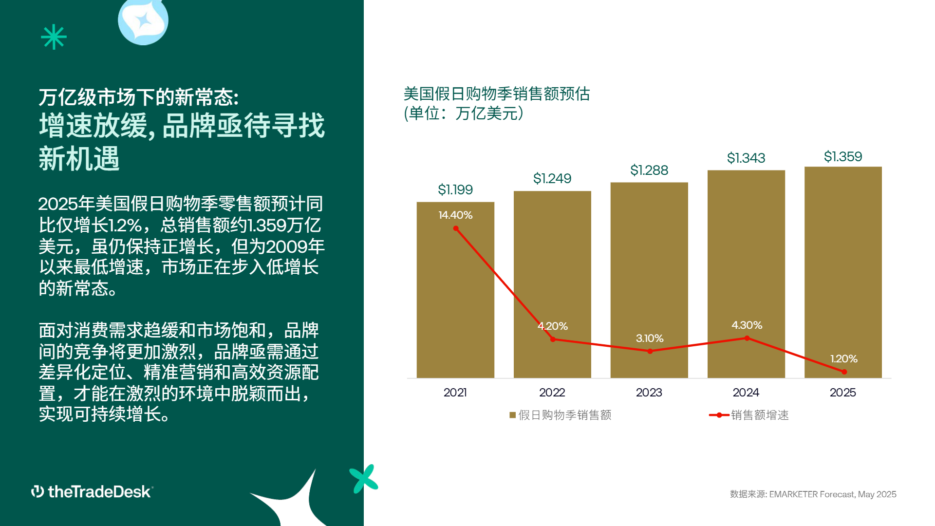 报告聚焦 2025 年全球假日购物季市场动态,通过多维度数据与消费者洞察,为品牌尤其是中国出海品牌提供了清晰的市场判断与实践方向。报告显示,2025 年美国假日购物季零售额预计同比仅增长 1.2%,总销售额约 1.359 万亿美元,虽保持正增长,但增速降至 2009 年以来最低,标志着市场正式步入低增长新常态,而消费需求趋缓和市场饱和进一步加剧品牌间竞争,差异化定位、精准营销与高效资源配置成为品牌突围的核心要素。从历史数据来看,美国假日购物季销售额从 2021 年的 1.199 万亿美元增长至 2025 年的 1.359 万亿美元,增速却从 14.40% 持续下滑至 1.20%,市场增长动能的转变倒逼品牌重新审视战略布局。
