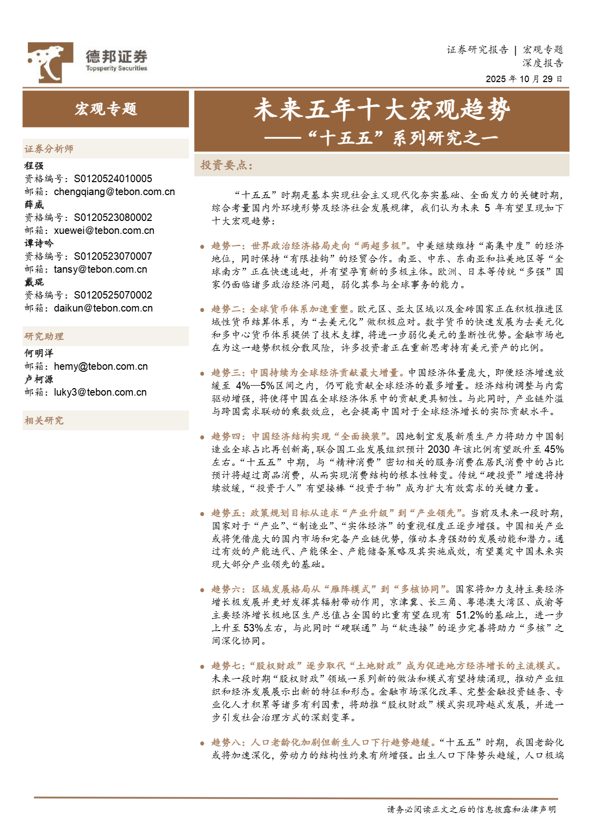 德邦证券于 2025 年 10 月 29 日发布的宏观专题深度报告(文件编号:5120092.pdf),聚焦 “十五五” 这一基本实现社会主义现代化的关键时期,结合国内外政治经济环境与发展规律,系统梳理了未来五年全球与中国经济将呈现的十大宏观趋势,为理解经济变革方向、把握发展机遇提供了全面参考。报告由程强、薛威等多位具备合规资质的证券分析师撰写,数据来源涵盖 Wind、IMF、联合国工业发展组织等权威平台,兼具专业性与实操性。