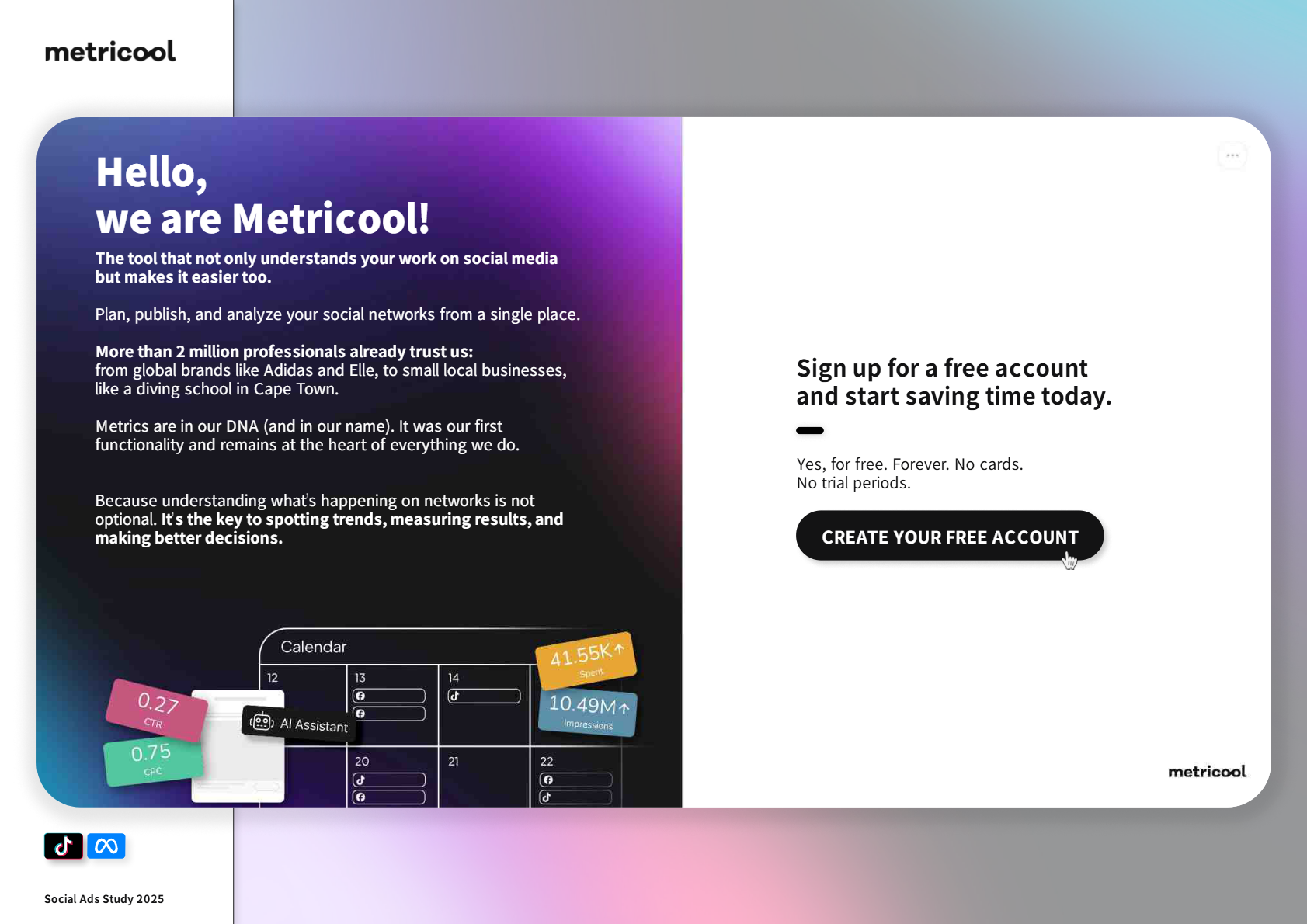 报告最终指出,品牌无需在 TikTok 和 Meta 之间二选一,策略性结合两大平台才能构建更完整、更高效的营销漏斗。利用 TikTok 在顶端曝光和中端流量获取上的优势,快速触达大量潜在用户并激发兴趣,再通过 Meta 在底端转化上的强势表现,推动用户完成购买决策,二者协同能最大化营销效果。此外,报告还提到,准确衡量广告效果的前提是确保账户配置正确,Metricool 作为整合型工具,可帮助品牌在一个平台上统一管理、分析两大平台的广告数据,提升运营效率,为广告策略优化提供数据支持。
