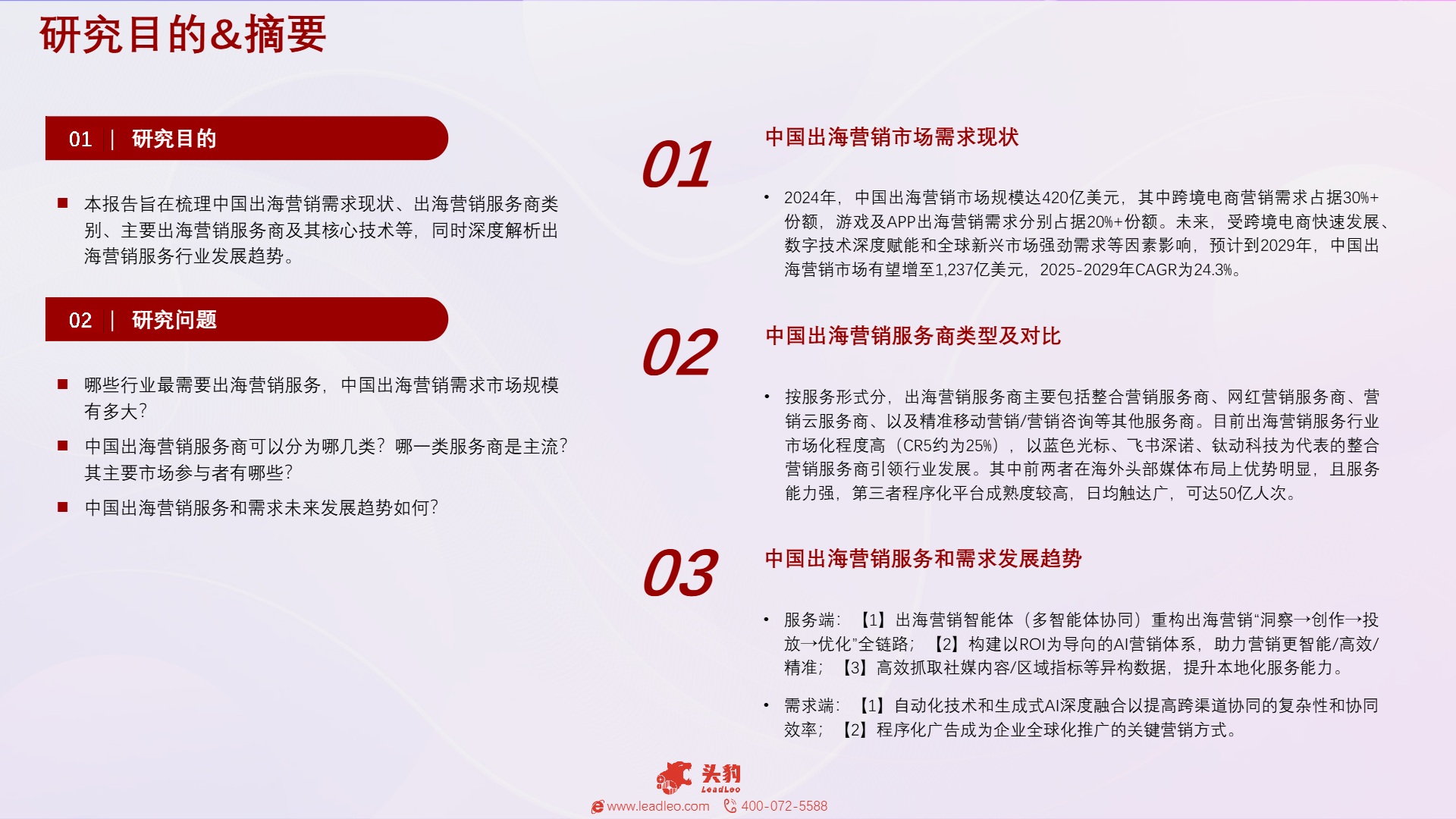 在服务格局方面,中国出海营销服务商按服务形式可分为整合营销服务商、网红营销服务商、营销云服务商及其他服务商,行业市场化程度高(CR5 约 25%),其中整合营销服务商引领行业发展,代表企业包括蓝色光标、飞书深诺、钛动科技等。蓝色光标 2024 年营收 608 亿元,出海广告投放营收达 483 亿元;钛动科技年度管理广告预算规模 50 亿美元,累计服务企业超 8 万家,通过 “1+7” 服务矩阵为电商、游戏、APP 等行业提供全链路营销解决方案。不同类型服务商各有侧重,整合营销服务商擅长全链路策略与资源整合,适合注重品牌建设的全球化企业;网红营销服务商聚焦达人资源对接,适合初期快速获客的企业;营销云服务商依托 SaaS 平台提供数据分析与自动化工具,更适配需精细化运营的 B2B 企业。