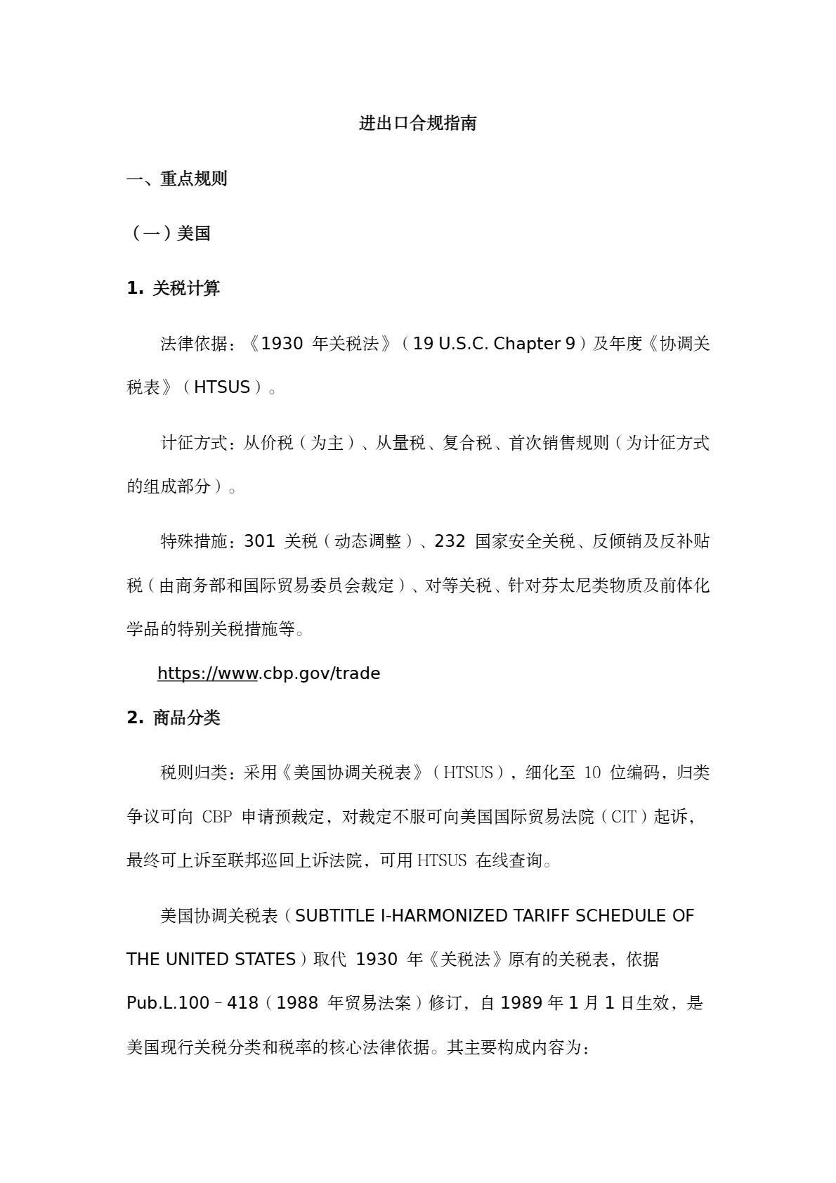 在全球化贸易深入推进的背景下,企业进出口业务面临的合规挑战日益复杂,不同国家和地区的关税计算、商品分类、估价规则及原产地认定标准存在显著差异,精准掌握这些核心规则成为企业规避风险、保障业务顺畅的关键。美国作为全球重要贸易伙伴,其进出口合规体系以《1930 年关税法》和年度《协调关税表》(HTSUS)为核心,关税计征以从价税为主,同时涵盖从量税、复合税等多种方式,还设有 301 关税、232 国家安全关税等特殊措施,动态调整特性要求企业持续关注政策变化。商品分类方面,美国采用 10 位编码细化分类,归类争议可通过申请 CBP 预裁定解决,对裁定结果不服可通过司法途径上诉;估价规则遵循 WTO《海关估价协定》,以交易价值为核心,关联方交易需额外举证 “正常贸易过程”,未满足时则依次适用相同或类似货物价格、倒扣价格等替代方法。原产地规则分为非优惠与优惠两类,非优惠规则以 “实质性转变” 为核心,通过税则归类改变、价值增值测试(如≥35%)或特定货物规则判定,进口货物需清晰标注原产国,否则可能面临罚款或扣押;优惠规则则依据不同自由贸易协定(如 USMCA),结合完全获得、税则归类改变、区域价值成分等要素,允许协定成员国间原产成分累积计算。