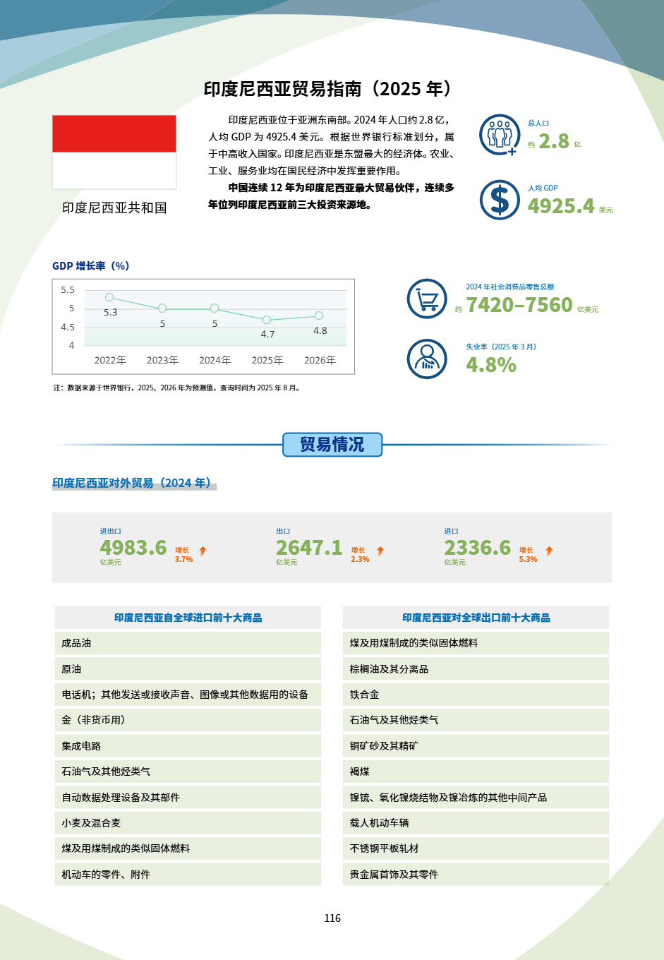 作为东南亚人口最多、经济总量居首的国家,印度尼西亚凭借庞大的消费基数与持续推进的工业化进程,成为中国企业开拓东南亚市场的核心目的地之一。截至最新数据,印尼总人口约 2.8 亿,2024 年人均 GDP 达 4925.4 美元,社会消费品零售总额介于 7420 至 7560 亿美元之间,失业率控制在 4.8% 的合理区间,经济基本面稳健向好。基础设施方面,印尼公路总里程约 54.8 万公里,高速公路 2816 公里,铁路网 6600 公里,拥有 1400 个港口,虽仍存在区域发展不均衡问题,但核心交通网络已能支撑大宗商品与消费品的流通需求,为跨境贸易提供基础保障。