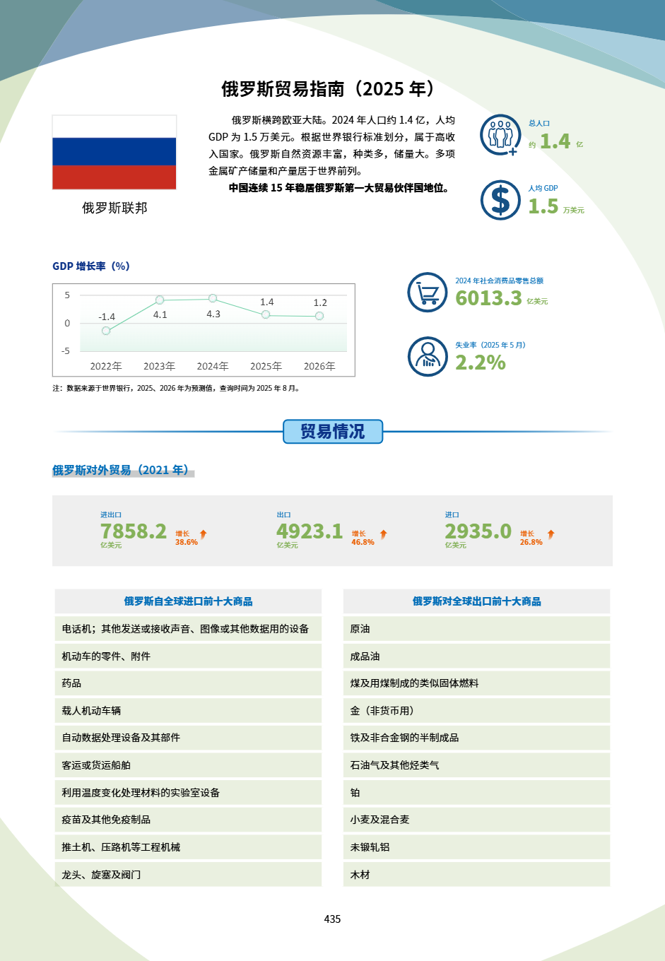 作为全球国土面积最大的国家,俄罗斯凭借丰富的自然资源与独特的产业结构,成为中国企业开拓欧亚市场的重要合作伙伴。从经济基本面来看,俄罗斯经济以能源、冶金、农林等产业为支柱,2024 年粮食产量约 1.3 亿吨,木材储量达 823 亿立方米,能源产品与矿产资源的出口在国际市场占据重要地位;同时,自 2015 年成立进口替代委员会以来,俄罗斯在汽车制造、农林机械、机床、油气装备等 20 余个行业持续推进进口替代战略,为外资企业参与当地产业升级提供了政策机遇。在贸易结构上,中俄双边贸易互补性显著,中国对俄罗斯出口的潜力商品以工业制成品为主,服装、有机化学品、钢铁制品、鞋靴、手机等凭借性价比与供应链优势,持续满足俄罗斯市场需求;而俄罗斯向中国出口的商品则聚焦资源类产品,能源产品、铝及制成品、铜及制成品、水产品、锯材、钾肥等,既契合中国工业化与消费市场的需求,也依托其资源禀赋形成稳定贸易流向,这种互补性为双边贸易的长期增长奠定了坚实基础。