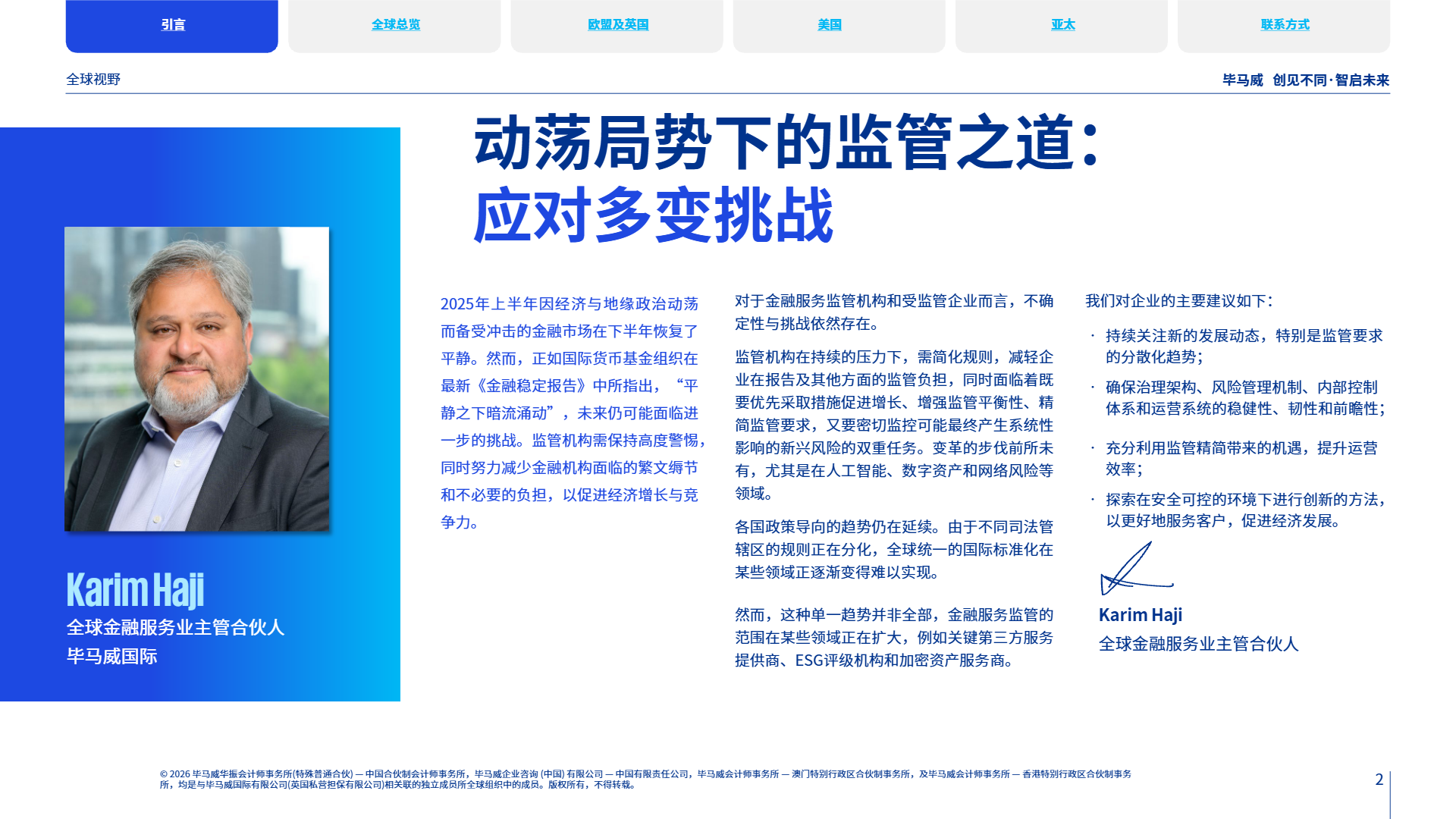2026 年的全球金融监管,既是对过往规则的修正与优化,也是对未来风险的预判与防控。区域分化不会阻碍监管合作的深化,新兴领域的规则空白将逐步填补,金融行业在 “松绑” 与 “加严” 的平衡中实现高质量发展。对于金融机构而言,唯有精准把握监管趋势、强化合规能力、灵活适配区域差异,才能在这场监管重塑中站稳脚跟,为全球金融市场的稳定与繁荣注入持久动力。