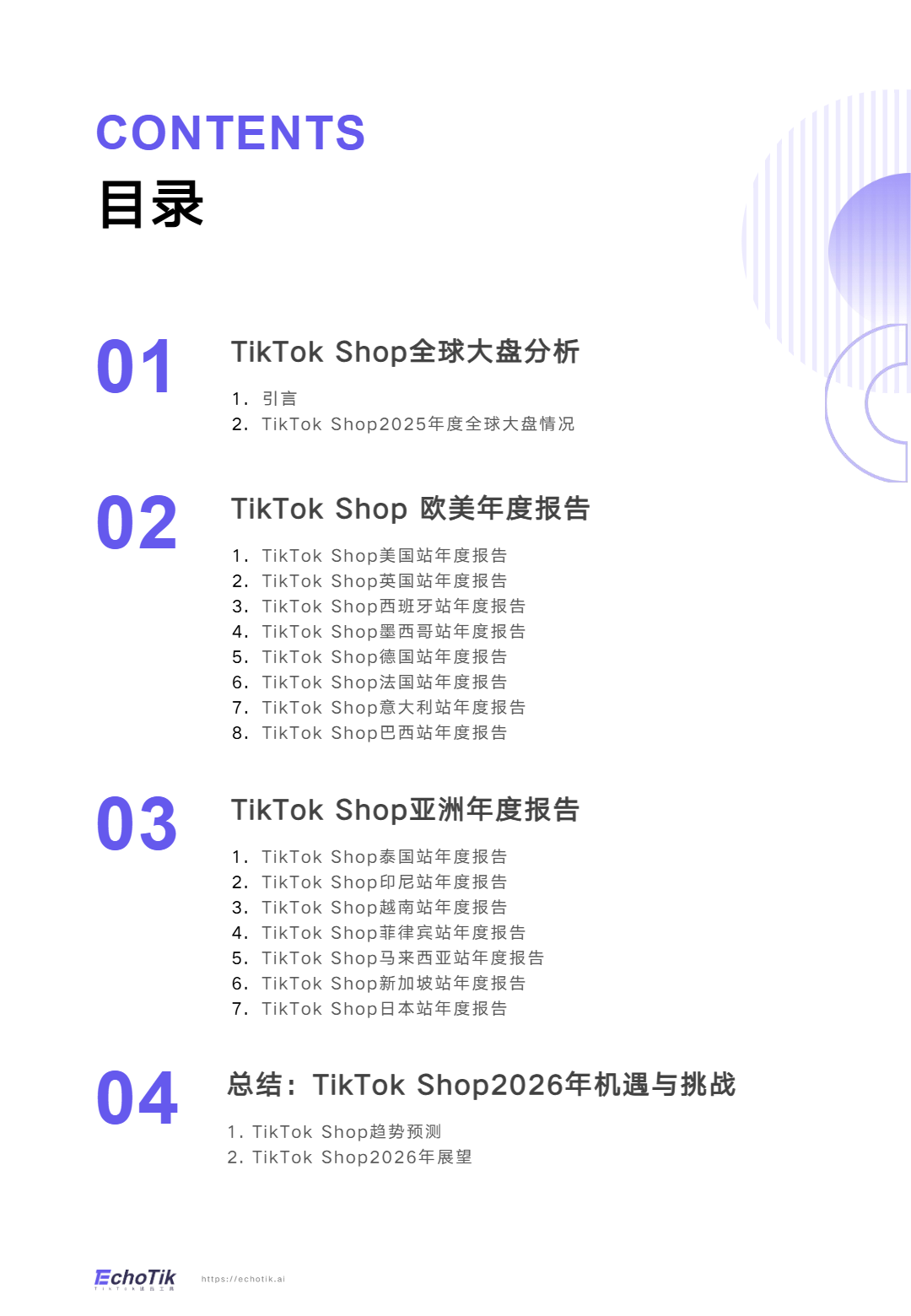 2025 年的快速扩张也为平台积累了扎实的生态基础,全球小店总量与达人规模持续扩容,巴西、德国等站点达人数量突破 600 万、379 万,为内容创作与商品传播提供了充足动力。技术赋能成为重要增长杠杆,平台通过数据驱动优化选品与运营效率,AI 工具的应用逐步深化。展望 2026 年,TikTok Shop 将进入 “精耕细作” 的新阶段,欧洲与日韩市场将成为重点发力区域,技术赋能、精细化运营与可持续盈利将成为核心关键词。随着 AI 选品助手等工具的全面上线,以及供应链与本地化服务的持续完善,平台将进一步缩小区域差距,推动全球市场协同发展,为跨境商家提供更广阔的增长空间,持续引领社交电商的全球化变革。