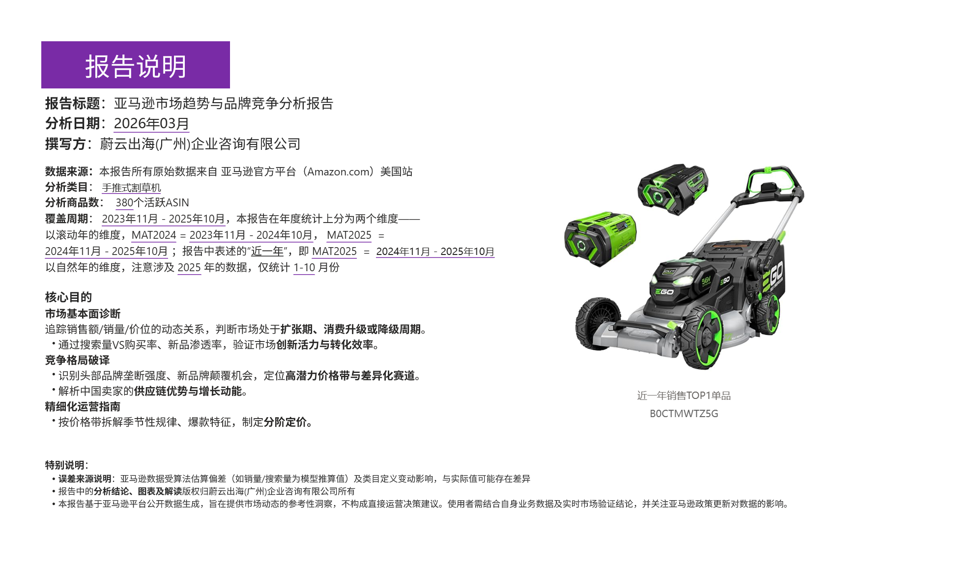 展望未来,市场的核心战略机会在于跳出同质化红海,精准把握结构性增长红利。对于具备供应链优势的中国卖家而言,有两条清晰的突围路径:一是以极致的供应链效率巩固 100-200 美元的规模基本盘,通过成本控制与精细化运营建立竞争壁垒;二是全力进军 400-500 美元的增长主引擎赛道,依托产品创新与品牌建设实现价值升级,从 “成本贡献者” 转型为 “价值定义者”。随着美国庭院养护需求的持续稳定,以及消费升级趋势的深化,手推式割草机市场仍将保持增长态势。未来,能够精准匹配价格带需求、打造差异化产品、构建品牌认知的企业,将在高度集中的市场格局中抢占先机,实现可持续的跨境增长。