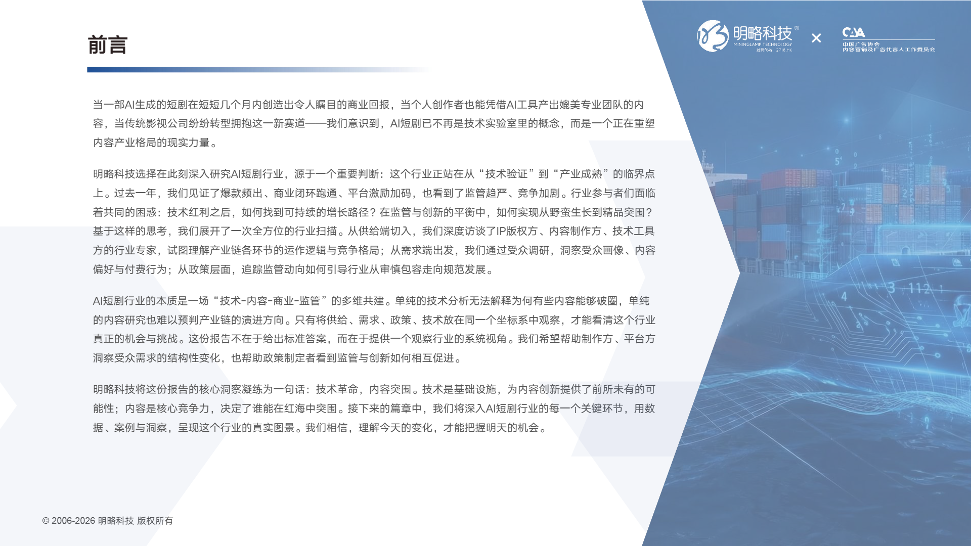 行业未来呈现四大明确趋势,技术上新一代 AI 模型持续降低创作门槛,推动 UGC 爆发与内容精品化;内容上 AI 仿真人短剧供给与播放量双爆发,成为增长最快的形态;商业化上品牌与 AI 短剧深度融合,定制内容、数字人 IP 成为营销新范式;出海方面,凭借成本、效率、题材与审核优势,中国 AI 短剧快速进入全球市场,多部作品登上海外热榜,形成 “中国制作、全球消费” 的文化输出新格局。整体而言,AI 短剧正以技术为底座、内容为核心、商业为动力、监管为保障,从野蛮生长转向规范精品化发展,不仅重构微短剧产业格局,更成为数字文化内容创新与出海的重要载体,未来有望以更快速度实现规模扩容与价值升级。