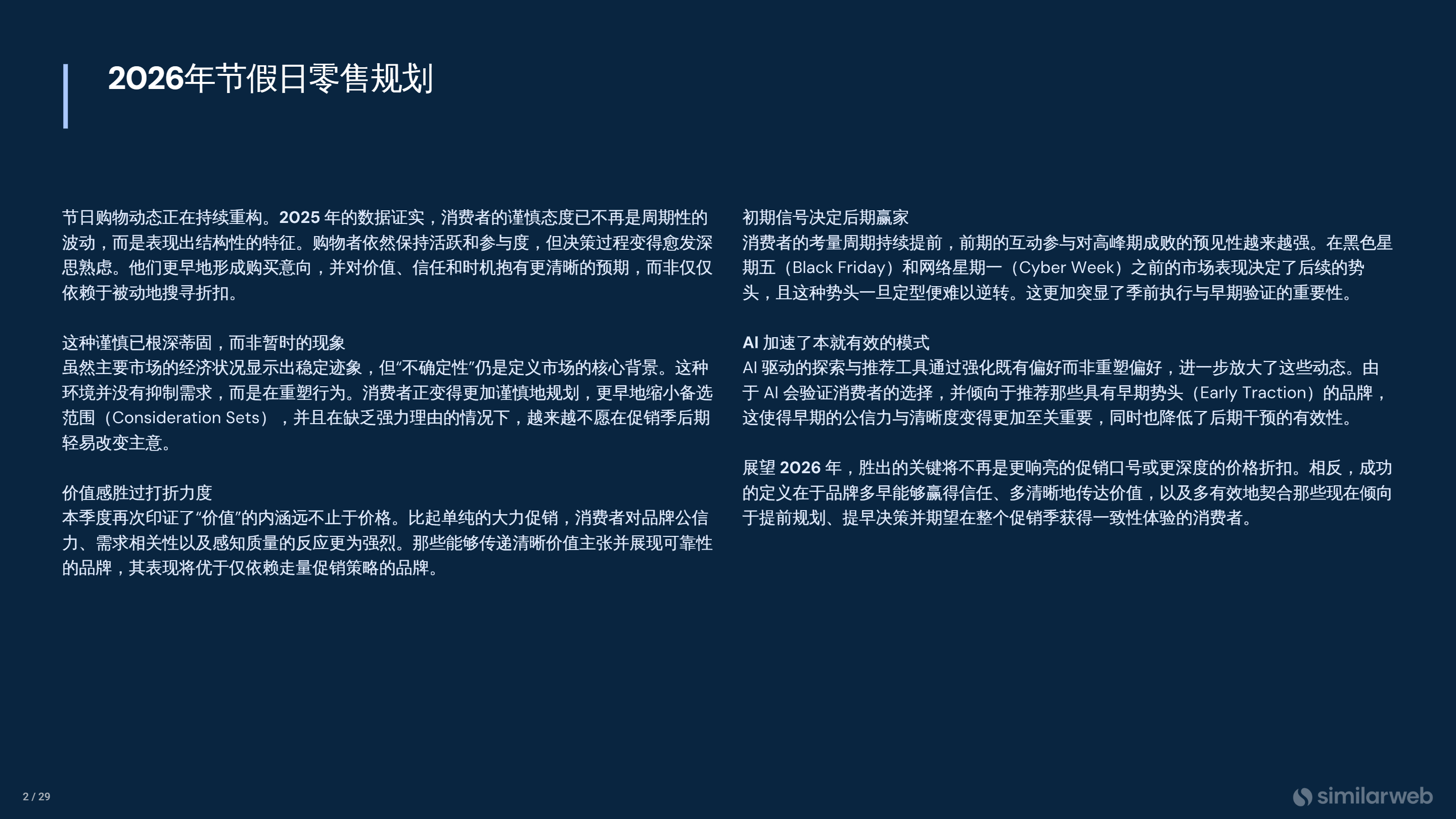 2026 年节日季零售规划报告指出,全球零售旺季的消费逻辑已发生结构性转变,消费者决策周期持续提前,谨慎理性成为长期趋势,不再单纯依赖折扣驱动,而是更看重品牌信任、真实价值与稳定体验,这使得季前布局与早期公信力建设成为制胜关键。AI 技术进一步放大了这一趋势,通过强化用户既有偏好、优先推荐早期起势的品牌,让前期市场表现直接决定旺季最终格局,后期干预效果显著下降。从消费者层面来看,2025 年节日季整体财务信心保持韧性,但年龄差异明显,年轻群体消费更为从容,年长群体两极分化严重,尽管多数消费者预期 2026 年财务状况平稳或改善,却仍坚持严控支出,减少购买数量、优先实用礼品、提前规划、分散促销节点、转向高性价比选择成为普遍行为,价格敏感已从短期现象变为结构性特征,亚马逊平台平均售价持续走低也印证了消费降级与理性克制的长期趋势。与此同时,消费者的调研行为显著增强,价格敏感度提升、提前规划、多渠道对比、等待大促、深度研究产品成为主流,品牌知名度不再是决策核心,在研究与对比阶段的持续可见度,才是进入用户选择清单的前提。节日消费节奏也从集中式爆发转向全周期分布,黑色星期五仍是重要节点,但增长已落后于整个假日季,促销周期大幅延长,11 月成为研究与预选阶段,12 月转为履约与最终采购,便利性逐步优于价格,核心爆款多为长期稳定需求产品,促销仅起到释放存量需求的作用,而非创造新爆款。分品类来看,电子、家居、玩具等品类均出现浏览量上升、转化率下降的现象,消费者评估更严谨,换机与更换周期拉长,微小创新难以驱动购买,仅美妆品类在美国市场保持较强转化势头。AI 正在全面重构消费路径,从辅助工具升级为决策核心环节,超五成用户计划在 2026 年增加 AI 使用频率,用于产品对比、价格查找、礼品推荐与价值验证,AI 引流转化率显著高于自然搜索与付费广告,大幅压缩转化漏斗。AI 推荐更重视产品信息的具体性、清晰度与相关性,而非大众知名度,结构化、标准化的产品详情页更容易获得优先推荐,品牌需通过规范参数、清晰场景、明确功能与成分说明提升 AI 可见度。报告认为,2026 年零售旺季的成功不再依靠高强度促销与低价竞争,而在于提前建立信任、清晰传递价值、全周期稳定触达,并深度适配 AI 驱动的新消费环境,品牌只有将早期规划、中期验证与高峰执行串联成完整体验,以用户价值为核心,才能在理性消费时代赢得长期市场。