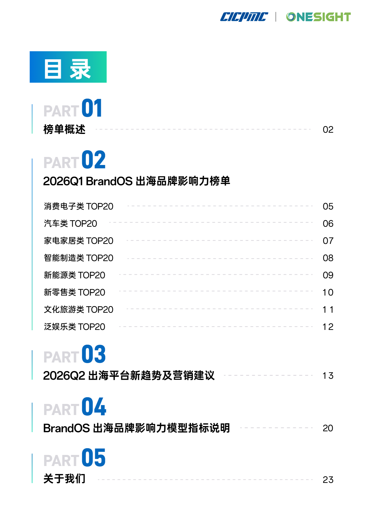 2026 年第一季度,由 OneSight 与中国国际跨国公司促进会联合发布的 BrandOS 出海品牌影响力榜单正式出炉,这份自 2019 年发起、2025 年完成升级改版的非商业性榜单,依托海外主流社交媒体平台公开数据,覆盖二十余个行业大类、近百个细分品类与近万个中国出海品牌,从跨域生态渗透力、多维交互聚合力、全球舆情牵引力三大核心维度综合评估,以客观公正的数据呈现出中国品牌在全球市场的传播实力与发展态势,为中国企业全球化布局提供了极具参考价值的行业标杆。本次榜单数据周期为 2026 年 1 月至 3 月,涵盖消费电子、汽车、家电家居、智能制造、新能源、新零售、文化旅游、泛娱乐八大核心领域,各赛道头部品牌表现亮眼,充分展现出中国制造与中国品牌向全球价值链高端攀升的强劲势头。